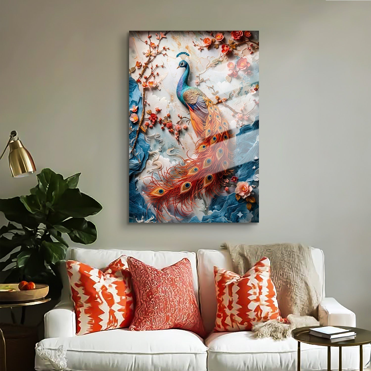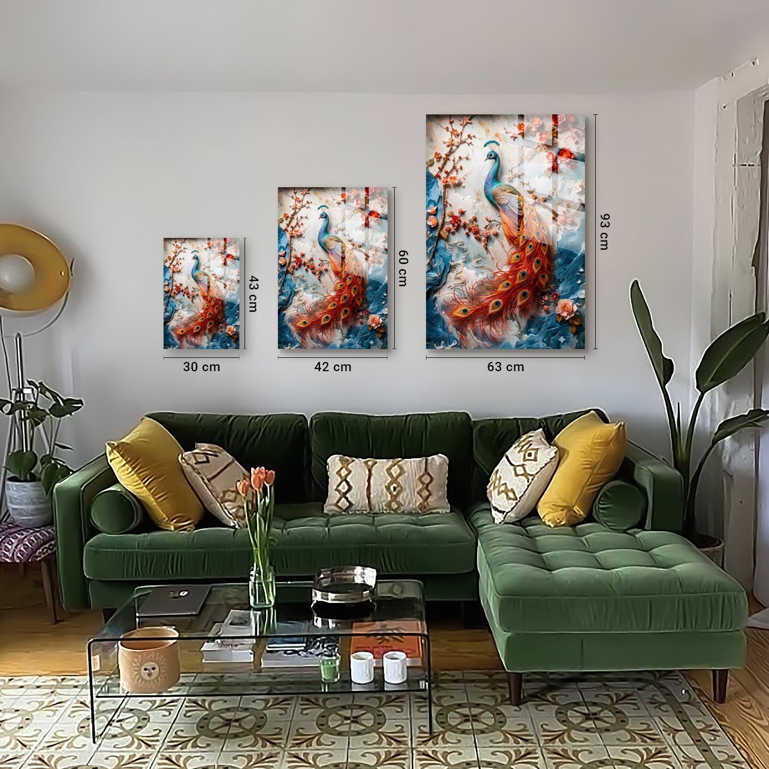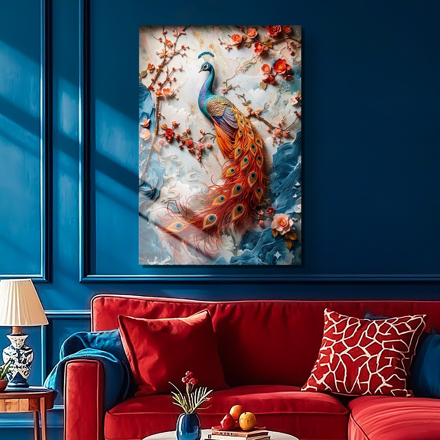 Carrying the majestic beauty of the peacock, this design brings a calm yet captivating energy to any space.