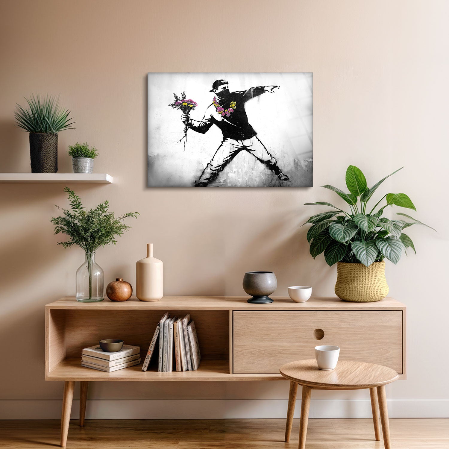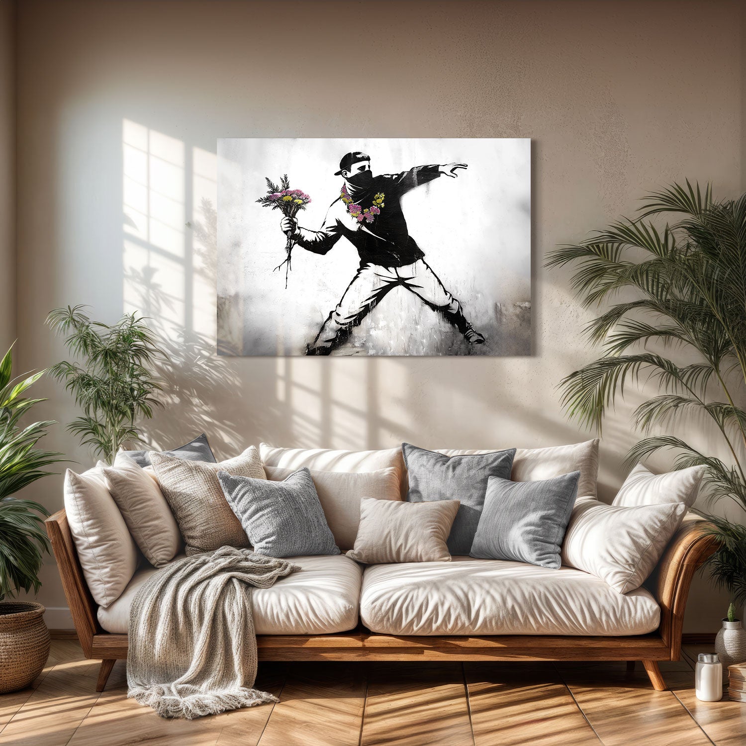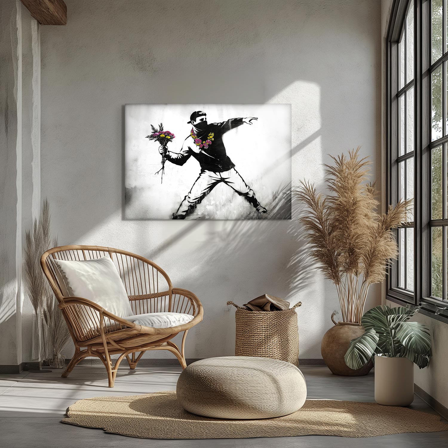 This wall art portrays a rebellious figure holding a bouquet of flowers, spreading hope and positivity to its surroundings with the flowers adorning its body, It invites everyone who observes it to believe in the power of beauty and art to change the world.