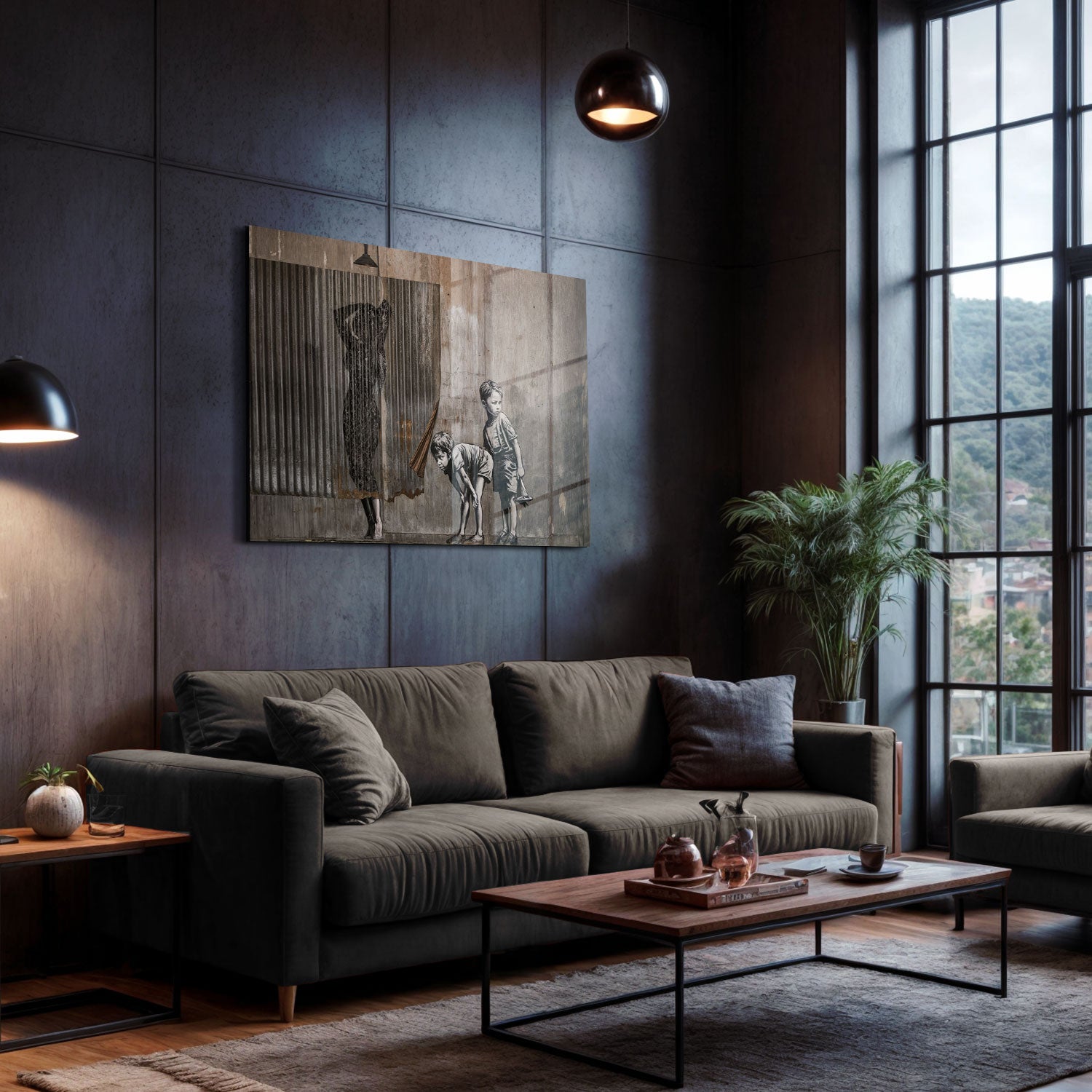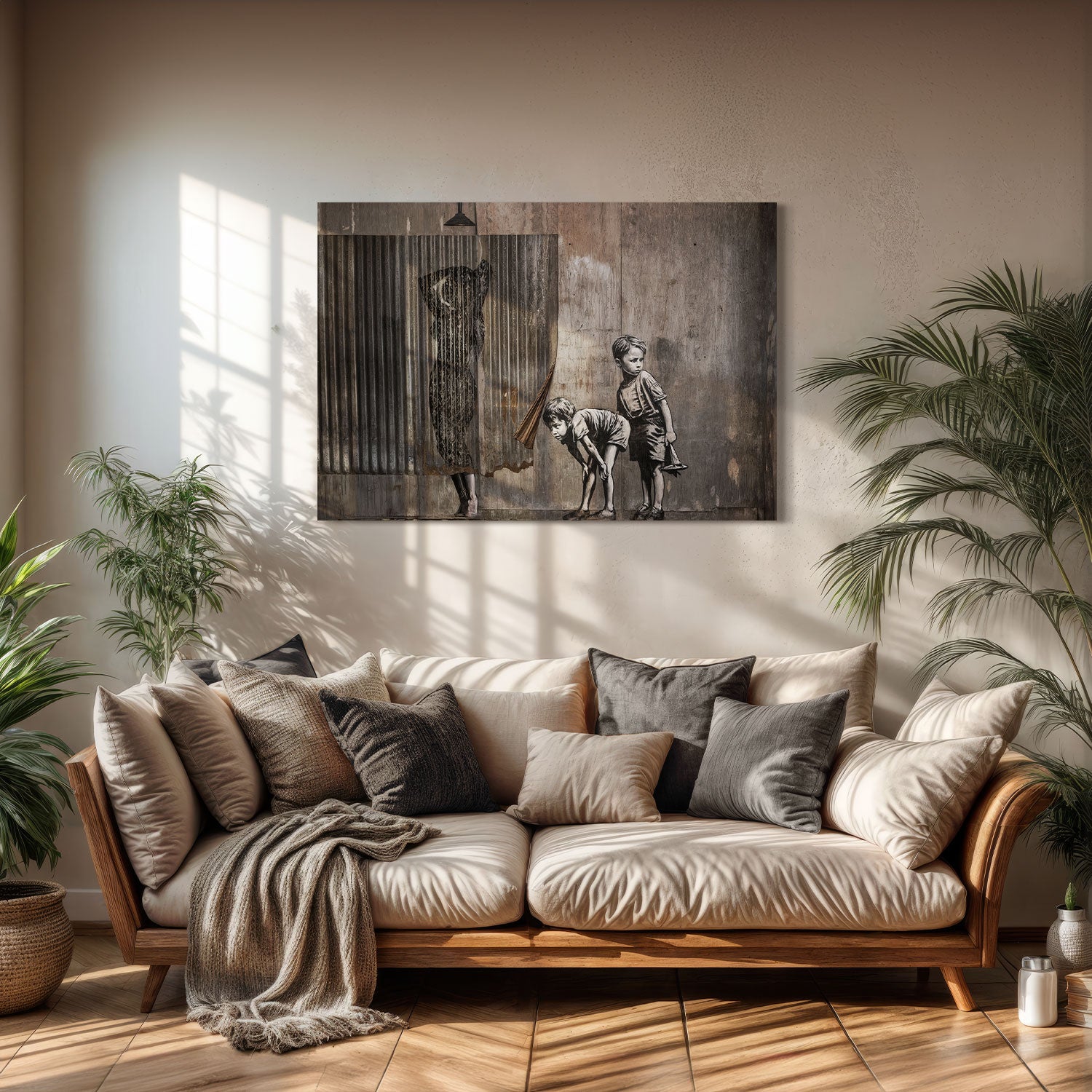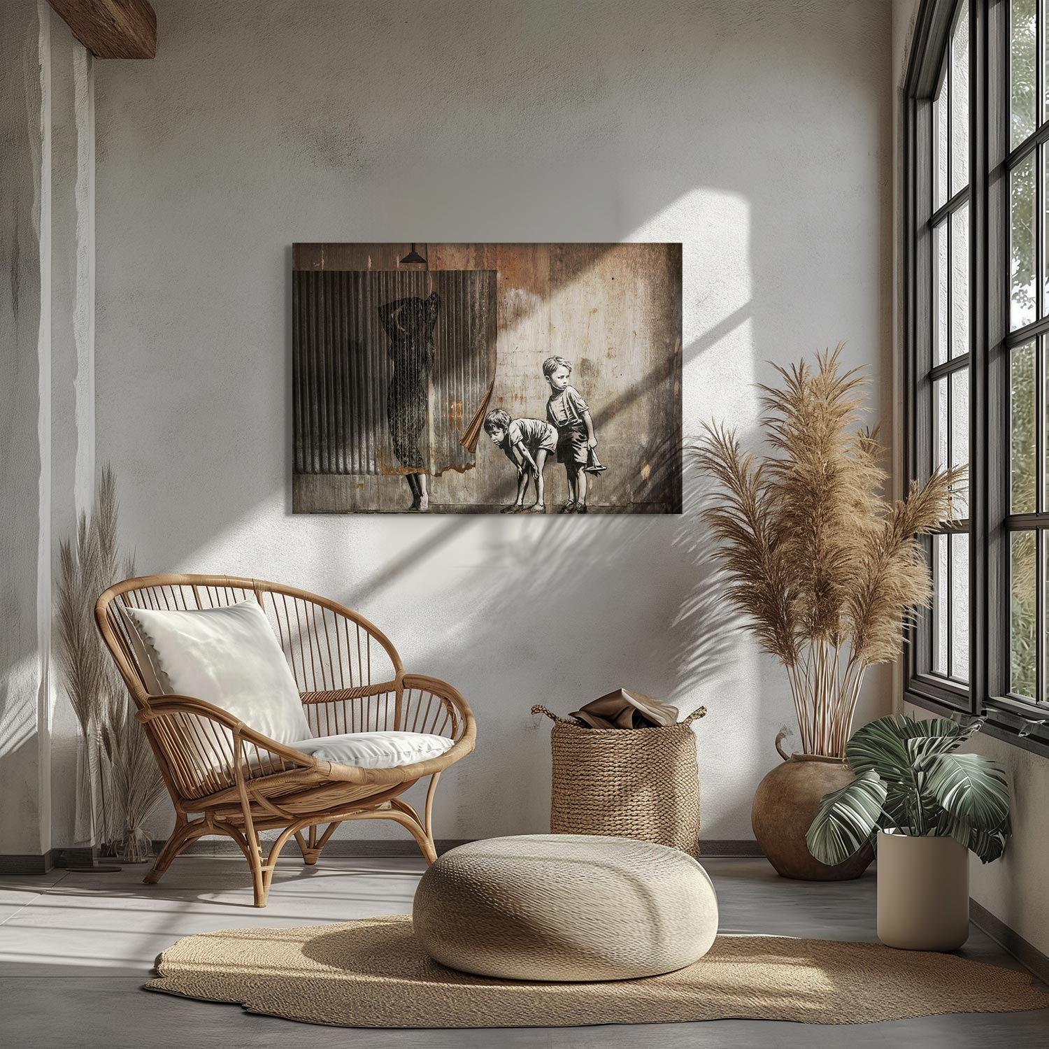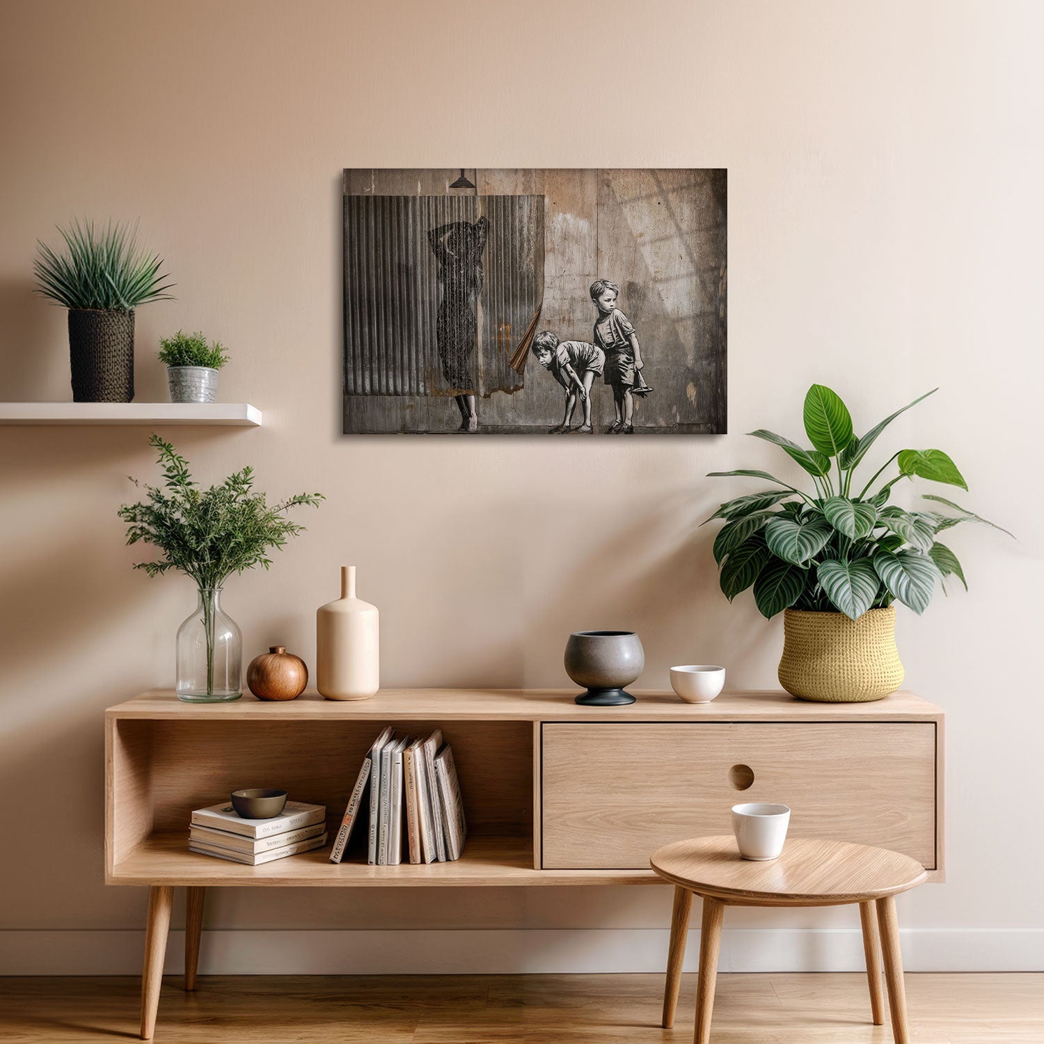 The silhouette hidden behind a curtain and the children chasing toys in front of it offer the opportunity to showcase a silent theater of street art in your home.