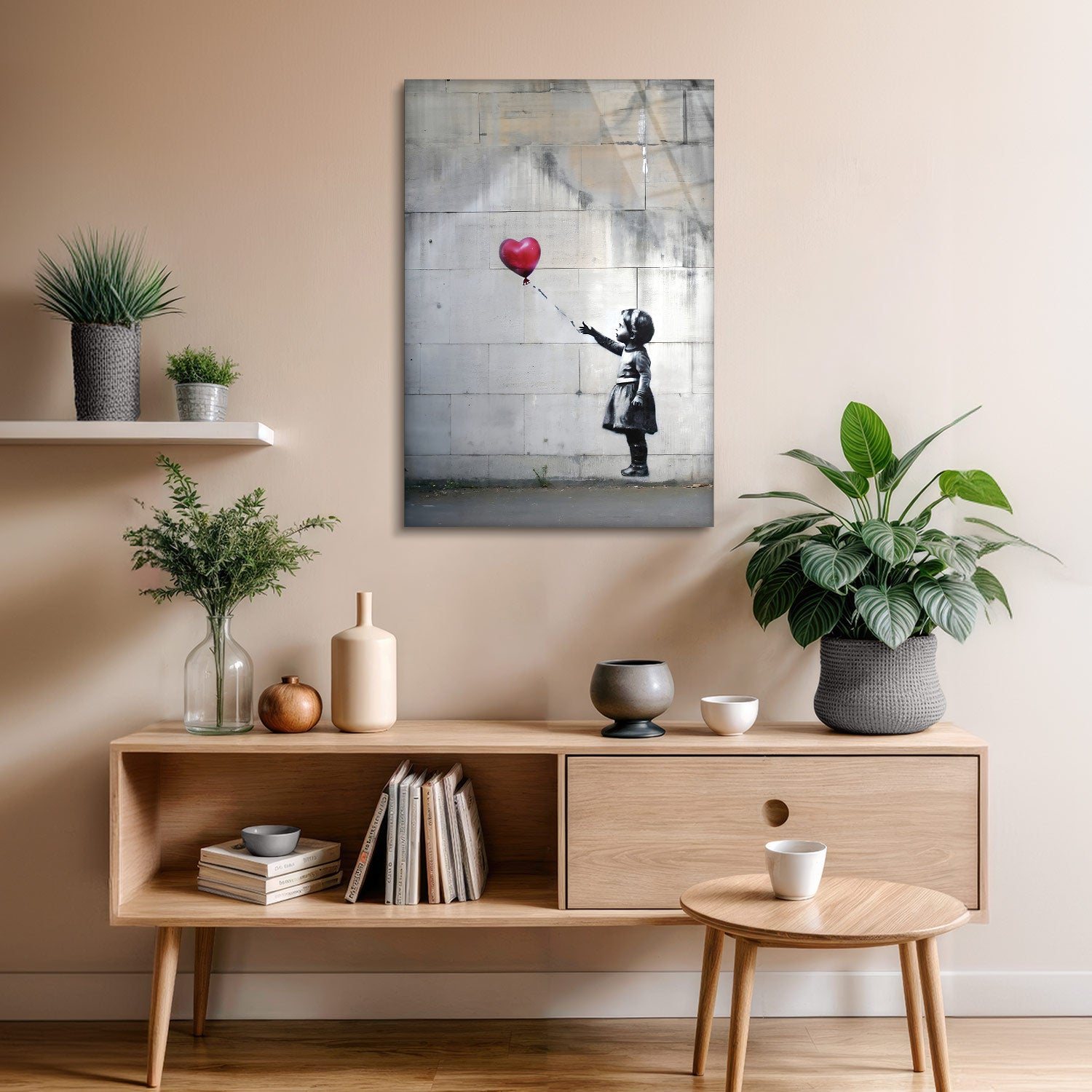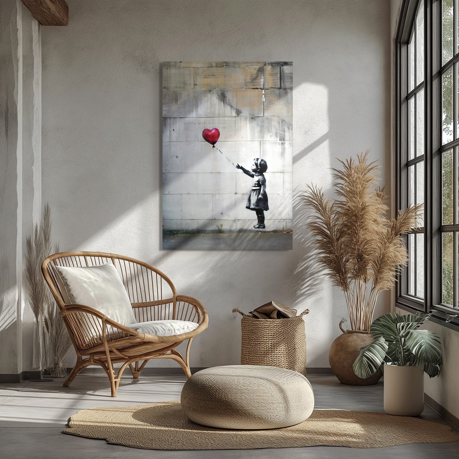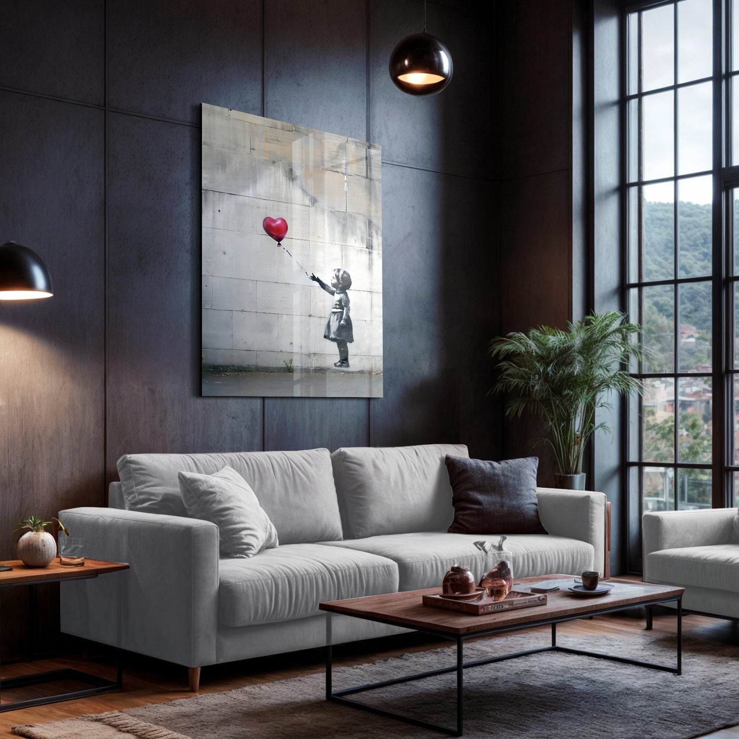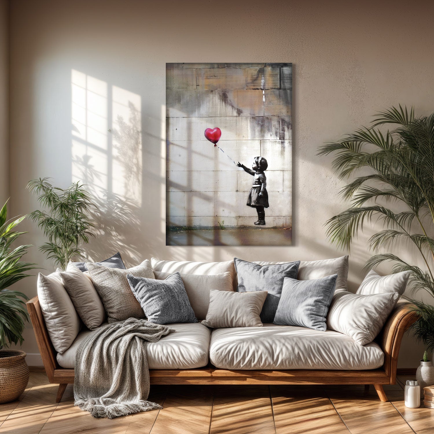 The red balloon flying from the hand of a little girl rises as a symbol of freedom and innocence, This artwork offers an opportunity to capture an untainted hope and to experience that moment every day in your home.
