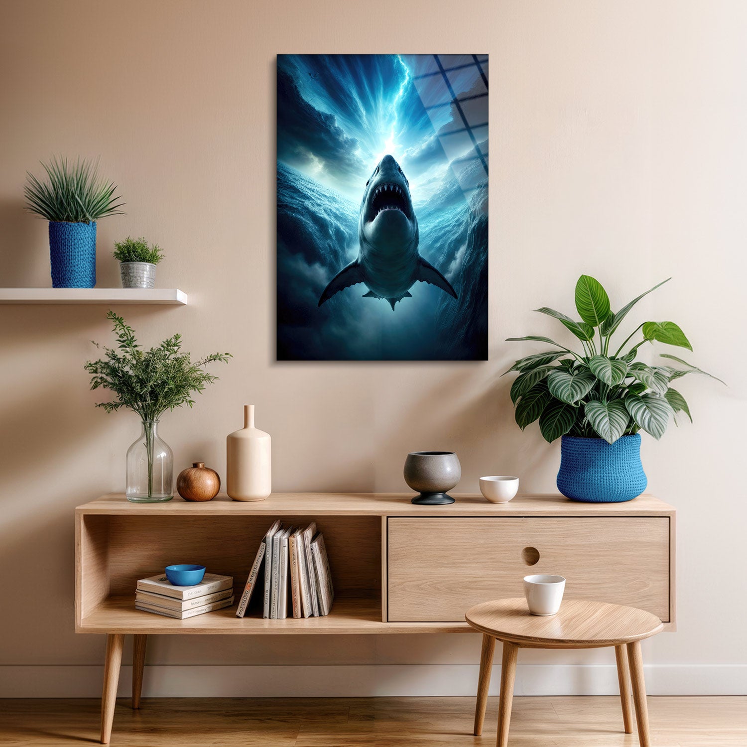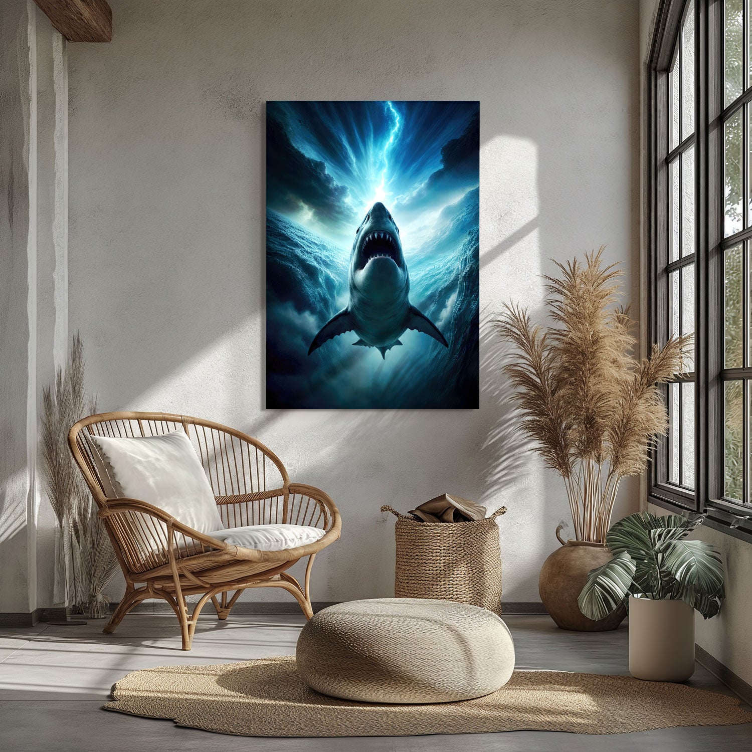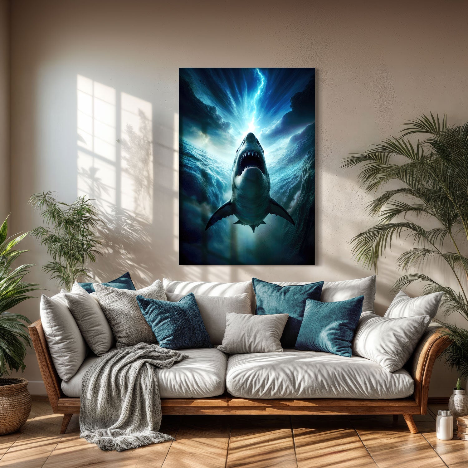 In the depths of the deep blue ocean, a shark rises with its open mouth and pointed teeth, dominating the scene, The majestic silhouette and the contrast between the shark and the blue waters bring the excitement of the depths of the sea to your walls.