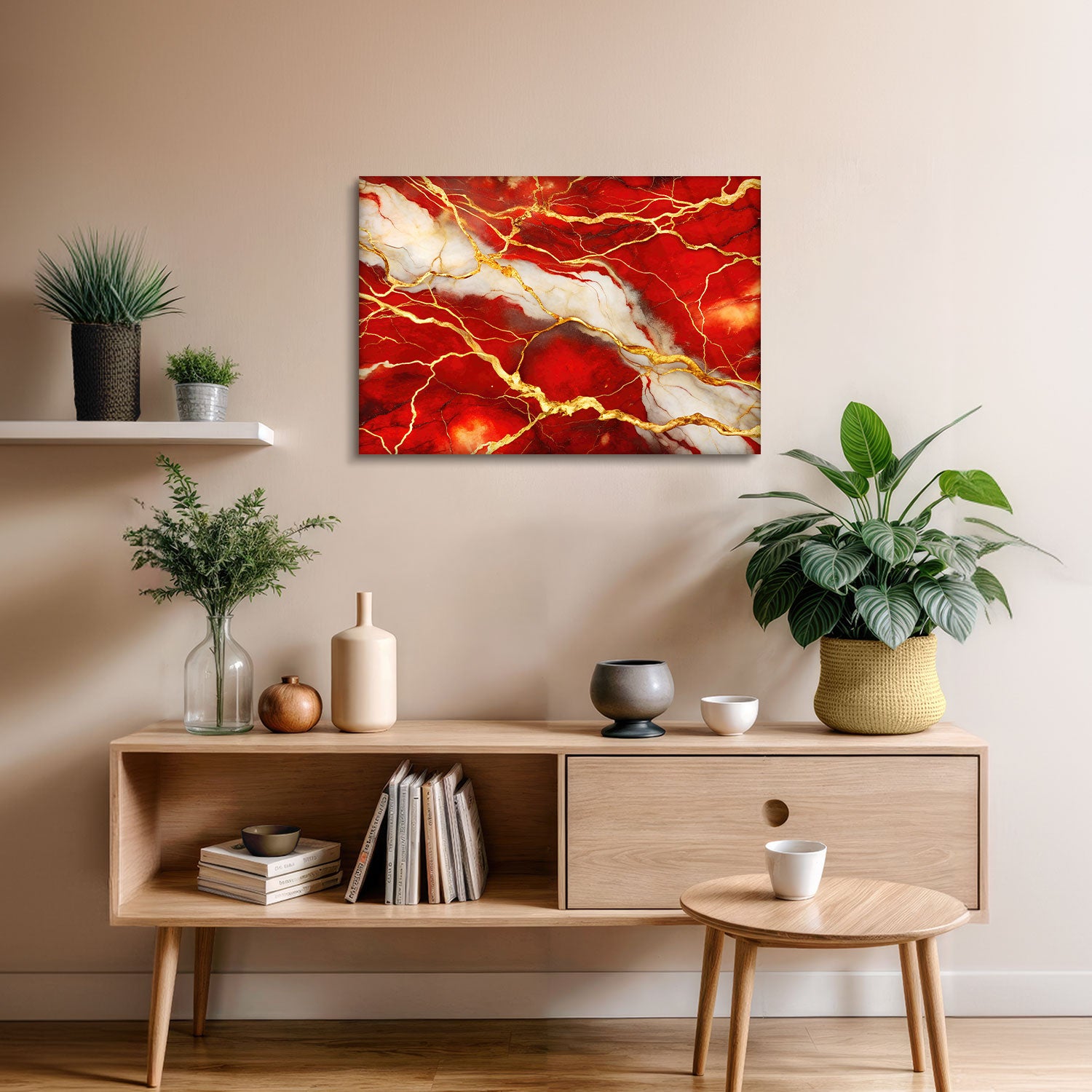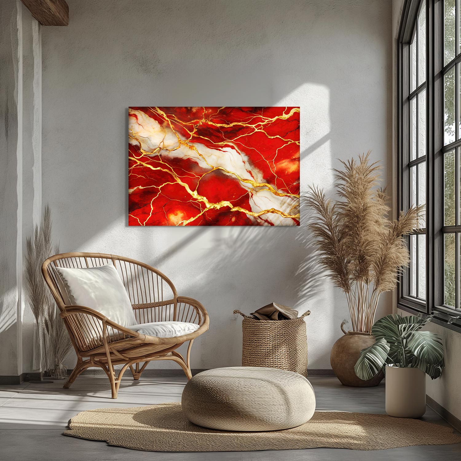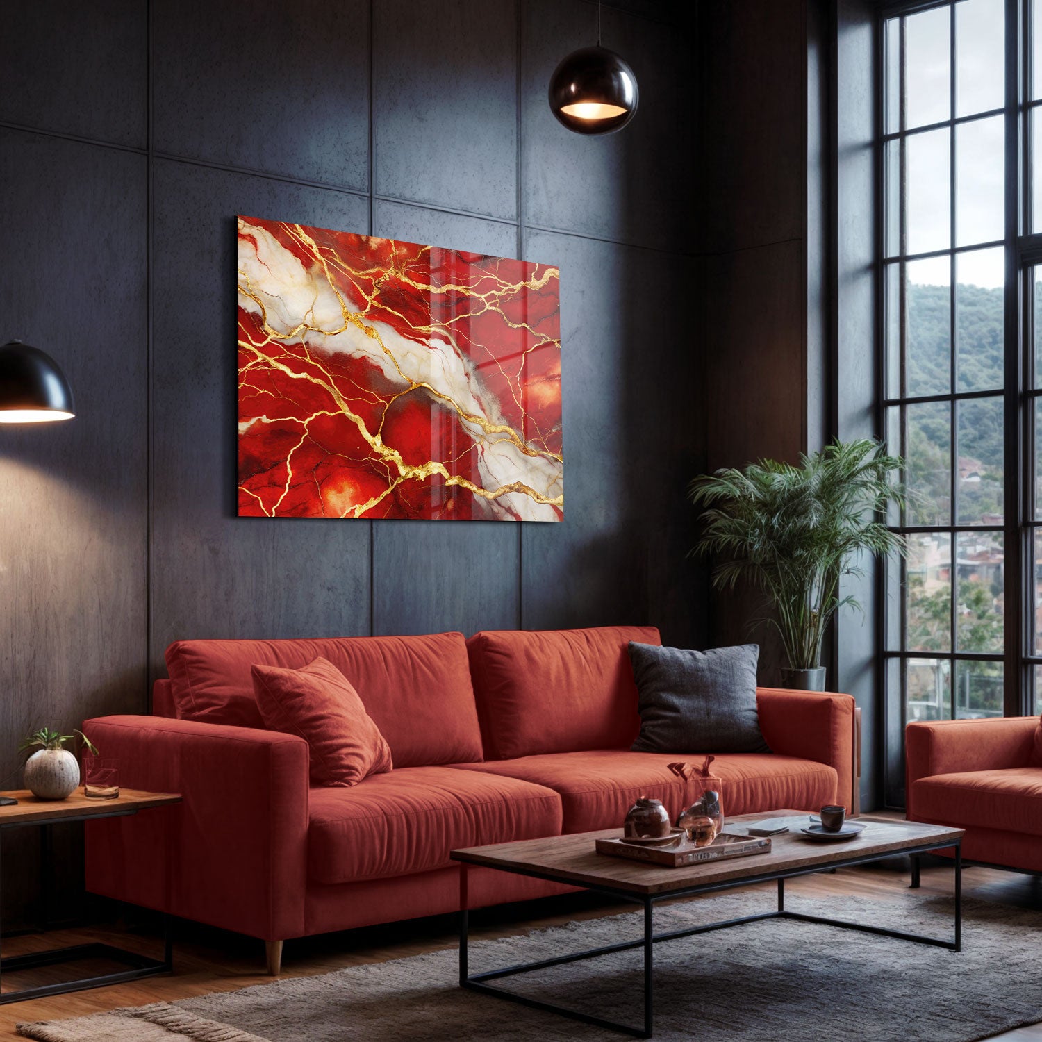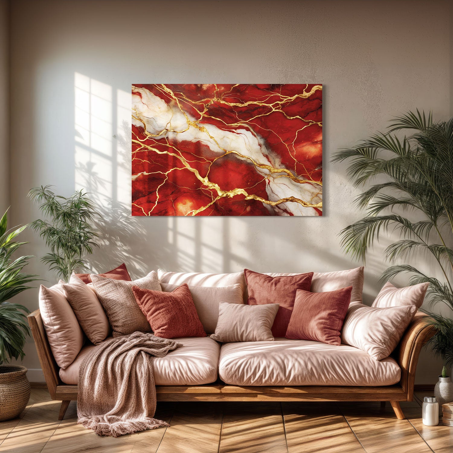 In this marble pattern intertwining red and white, golden cracks display a natural dance of both chaos and harmony, This stunning design will add dramatic beauty to your space, inviting you to pause in the hustle of daily life and rediscover the value of aesthetics.