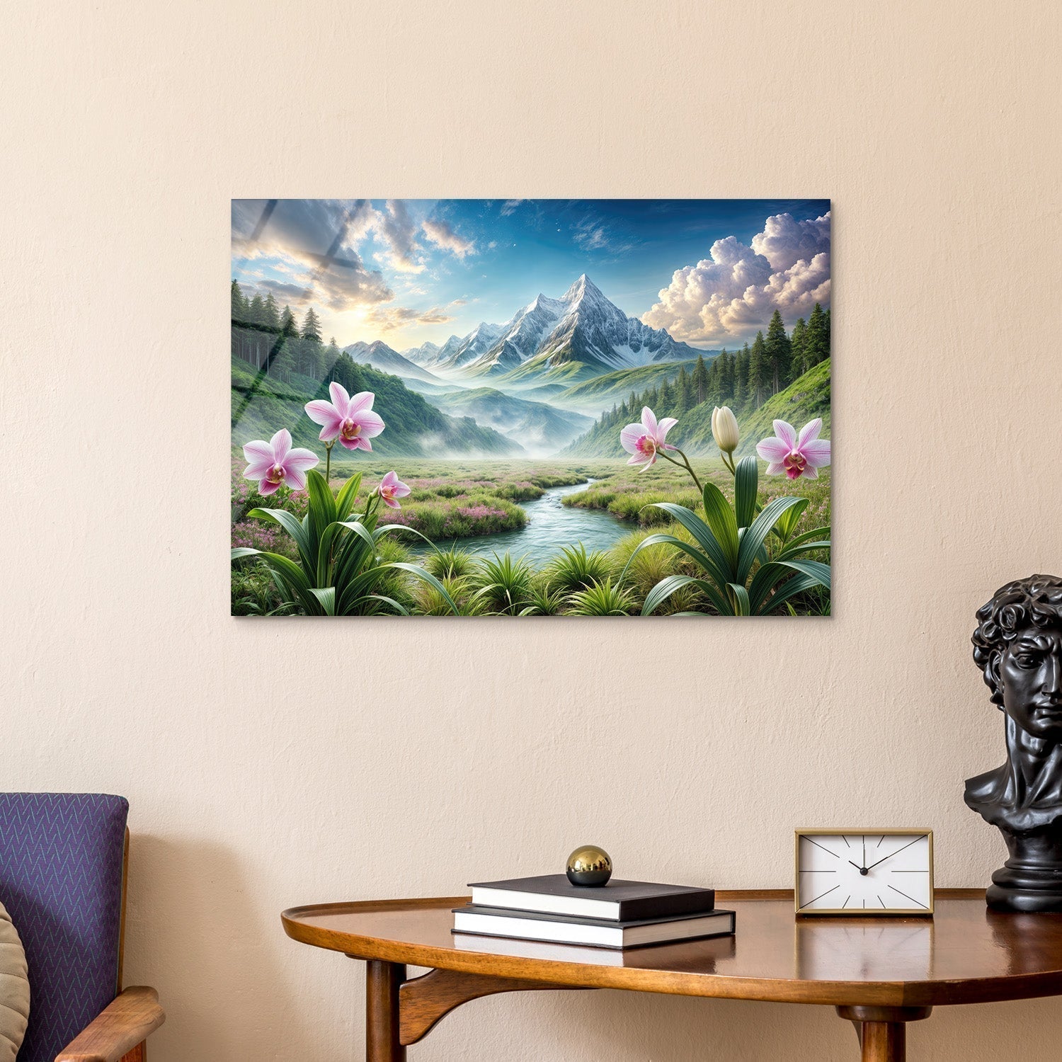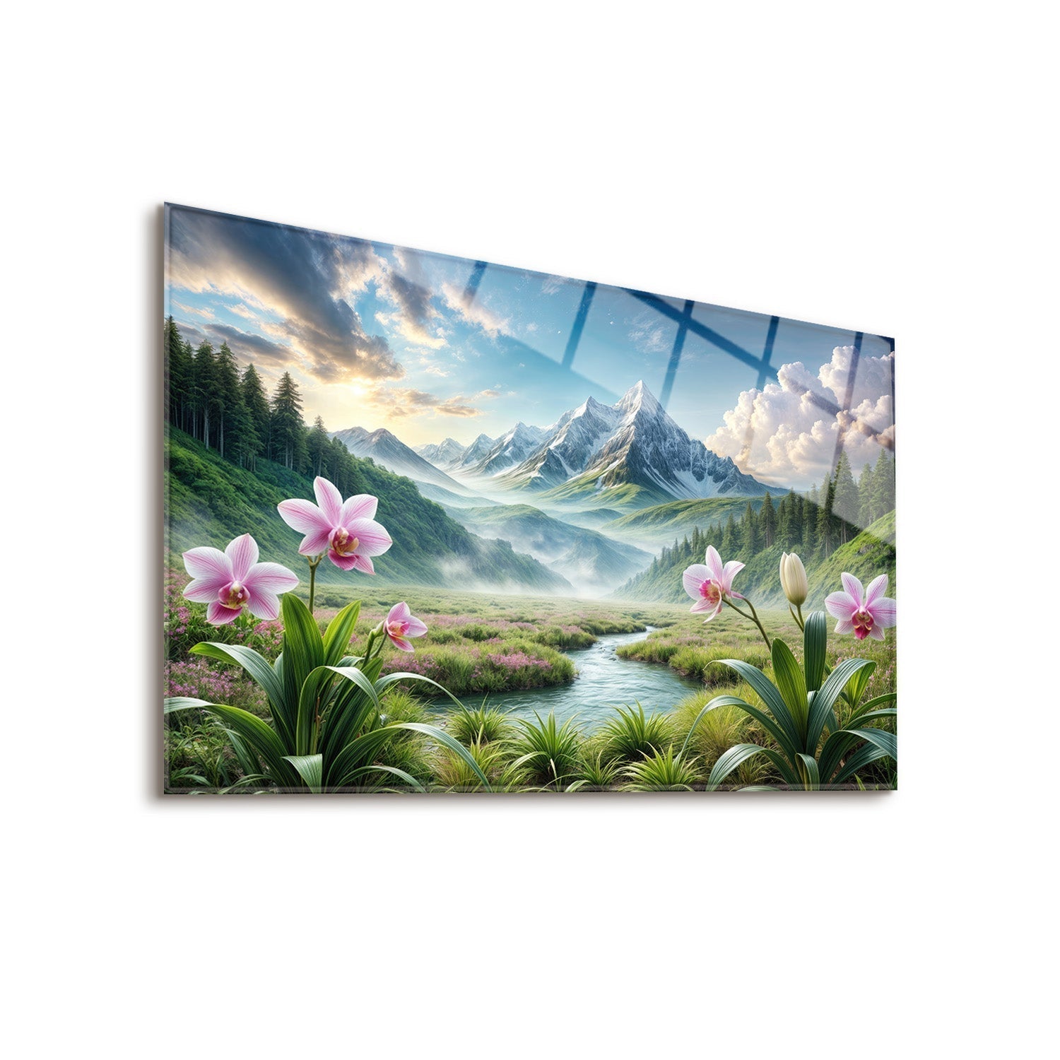 "Stunning orchids adorn a serene mountain landscape emerging from the mist, This natural wonder offers a breeze of tranquility and beauty, promising peace in your home,"