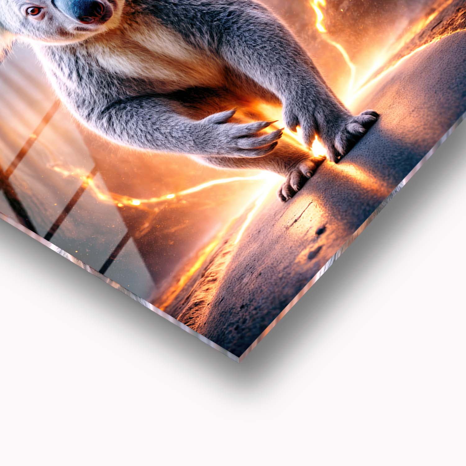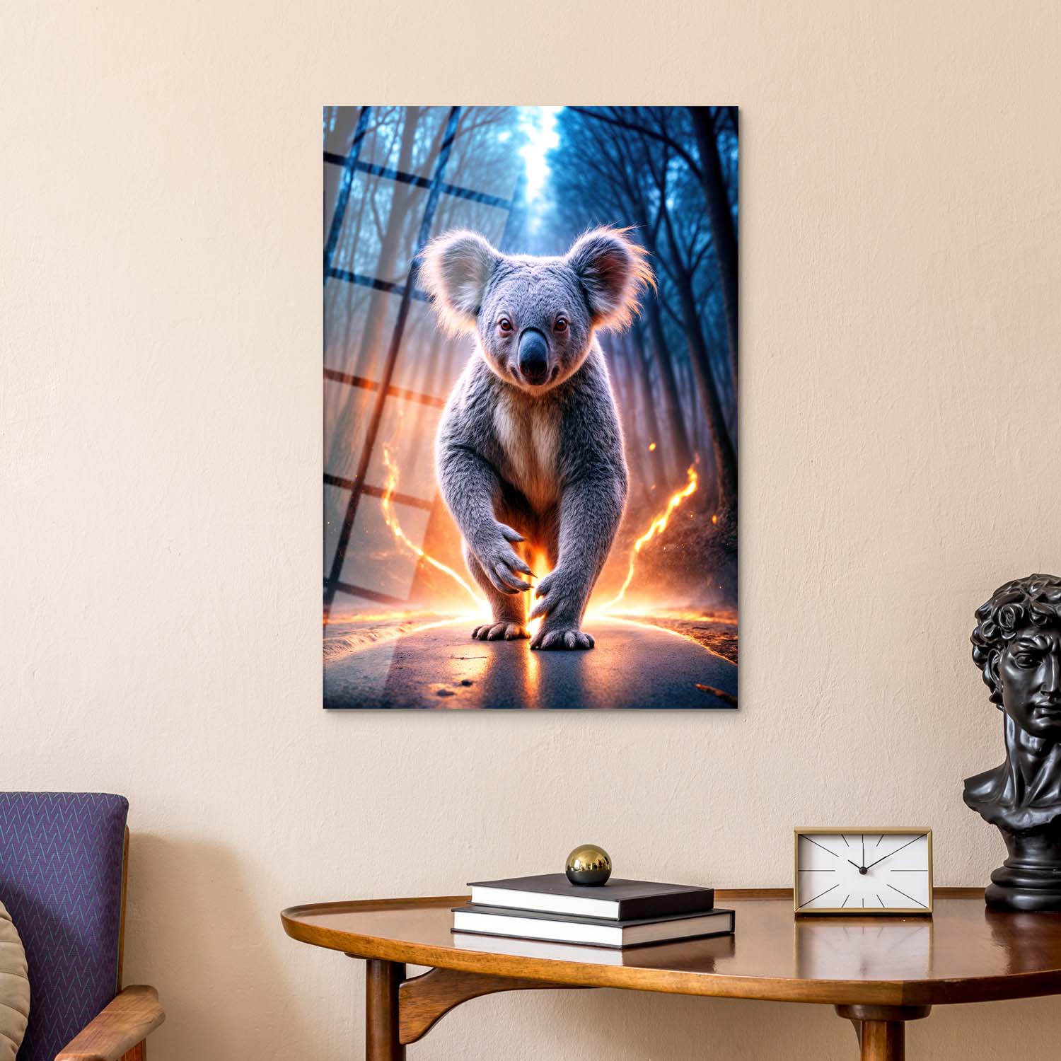 "Advancing along a forest path, a koala gazes towards us amidst the surrounding sparks, This captivating image brings to you the harmony of wildlife and natural elements,"