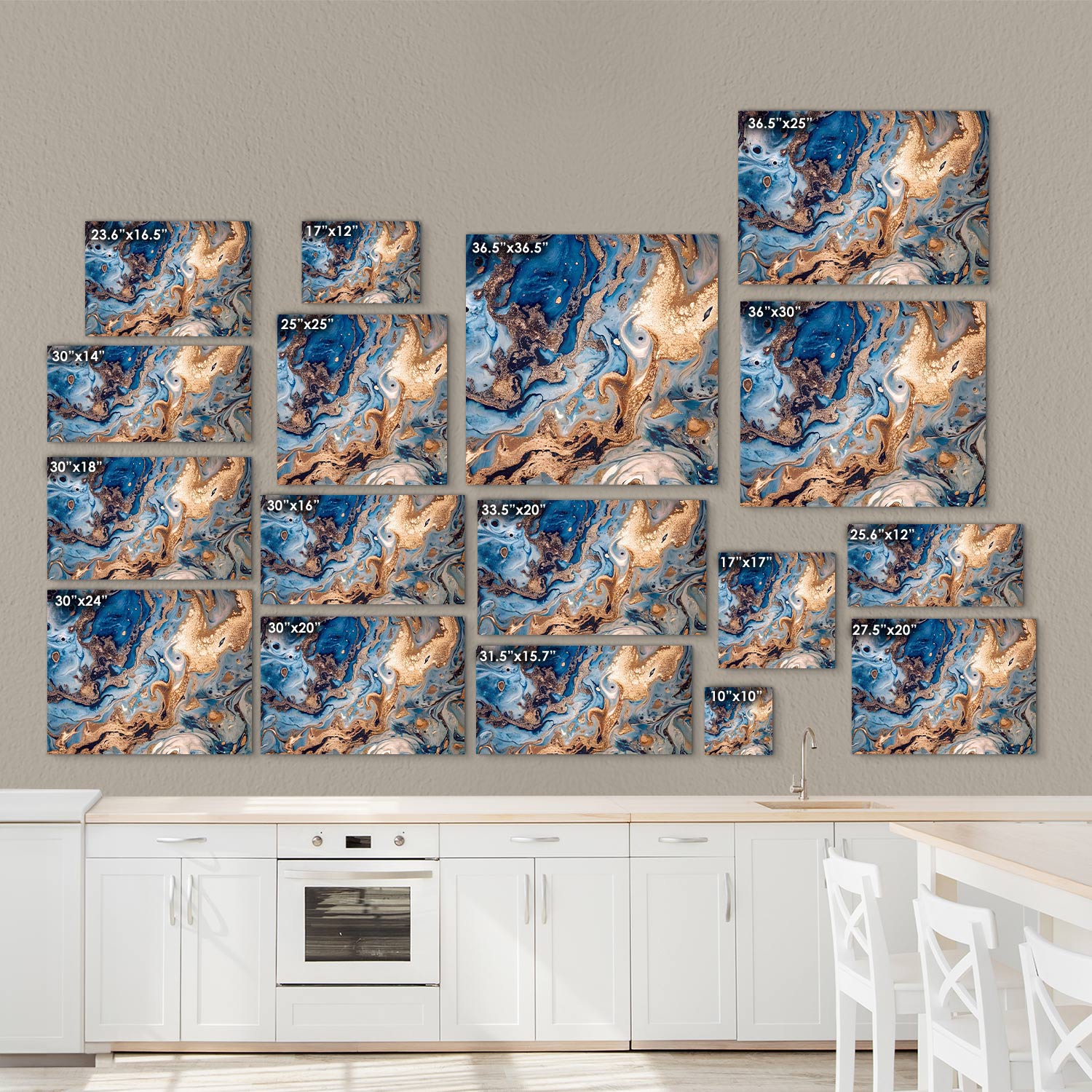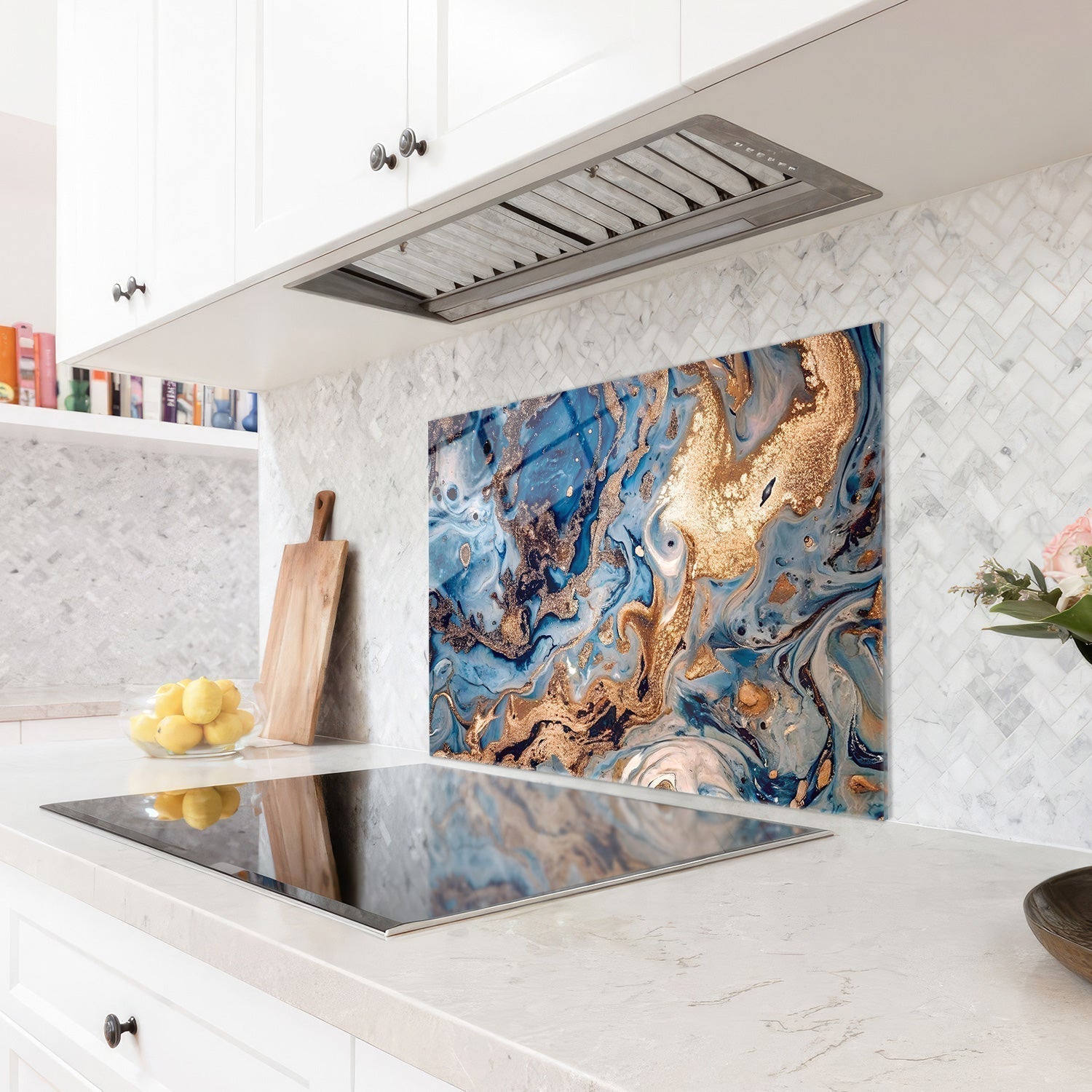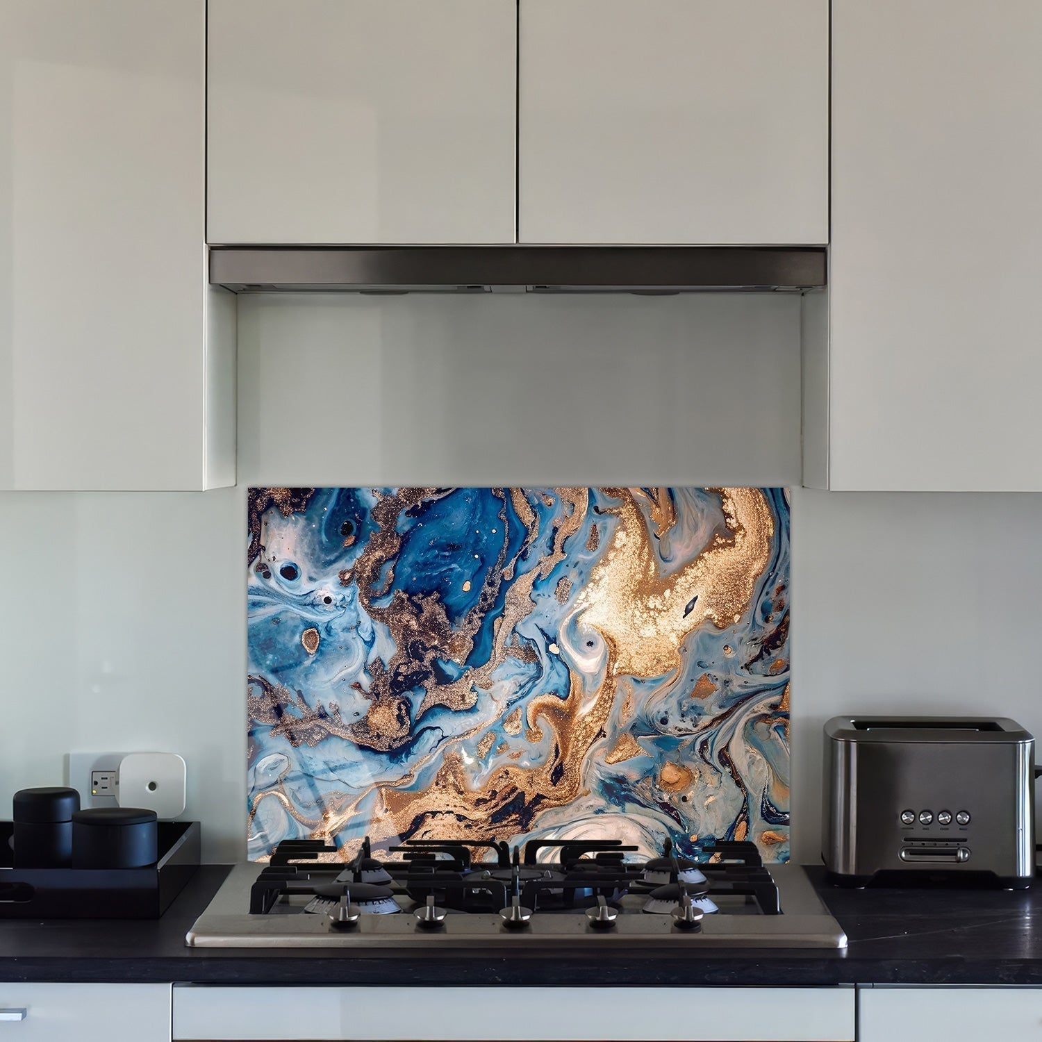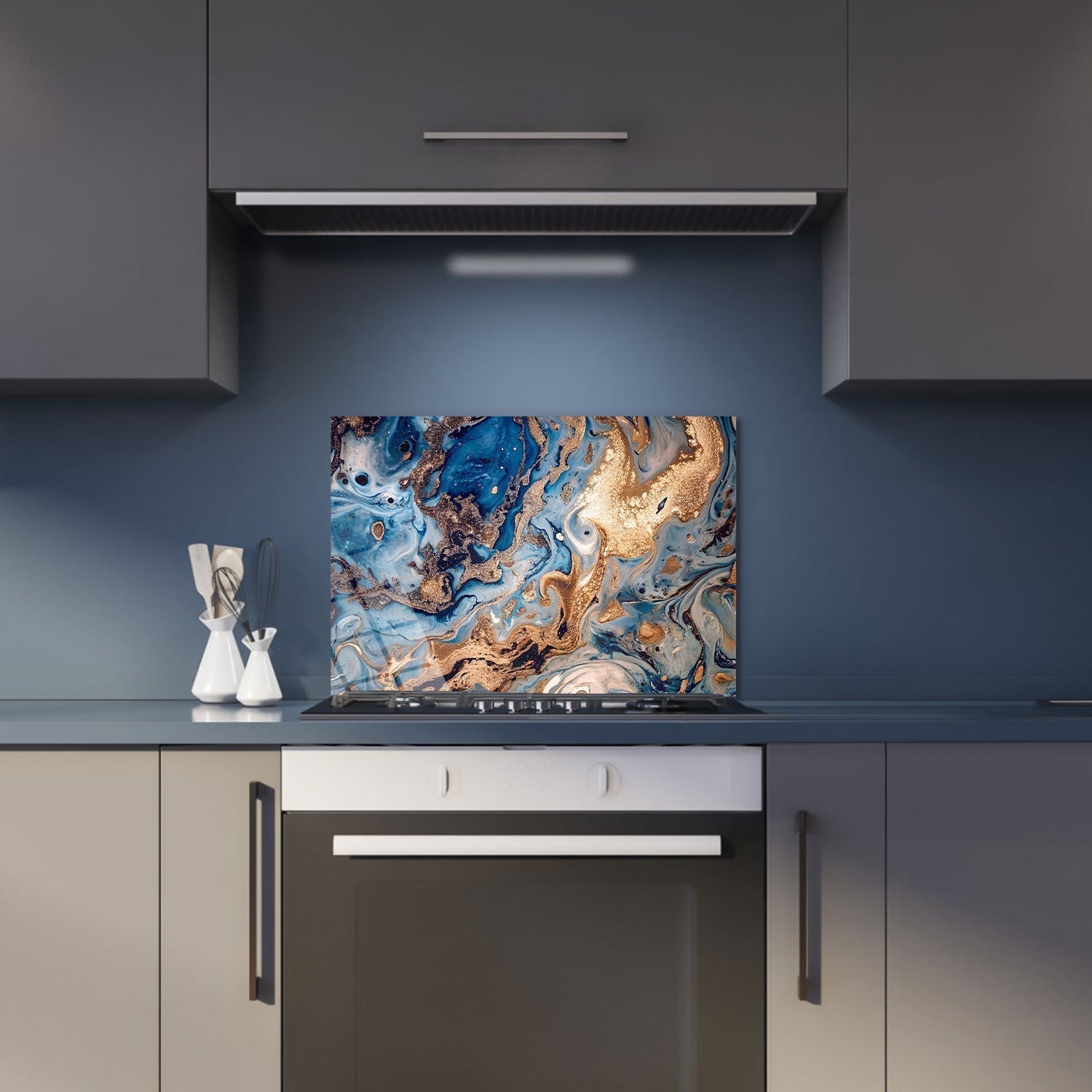 "The magnificent harmony of blue and gold not only offers aesthetic pleasure but also enriches every moment spent in the kitchen, The sparkle of this piece inspires your culinary artistry and takes you on a magical journey with every glance,"