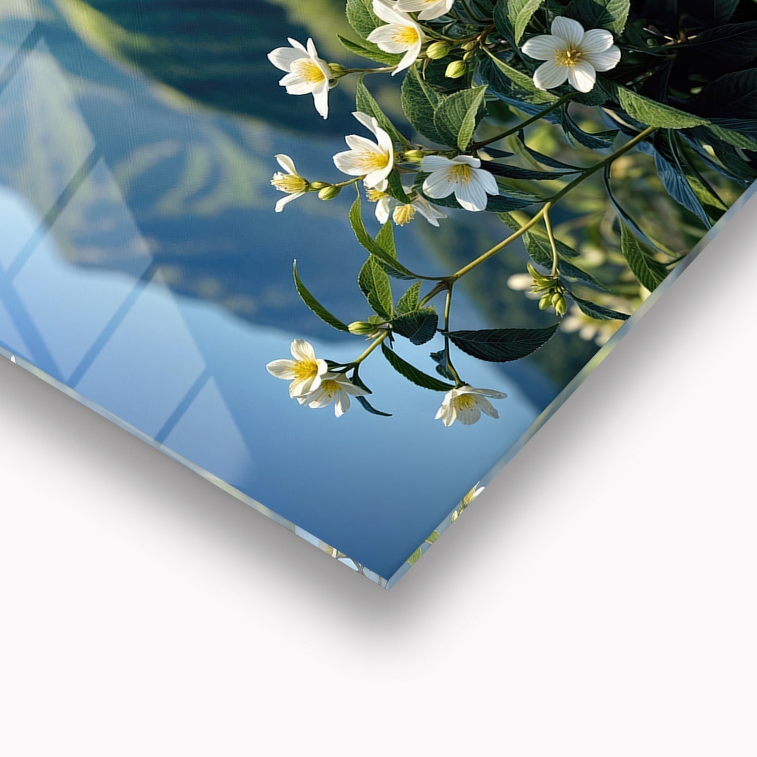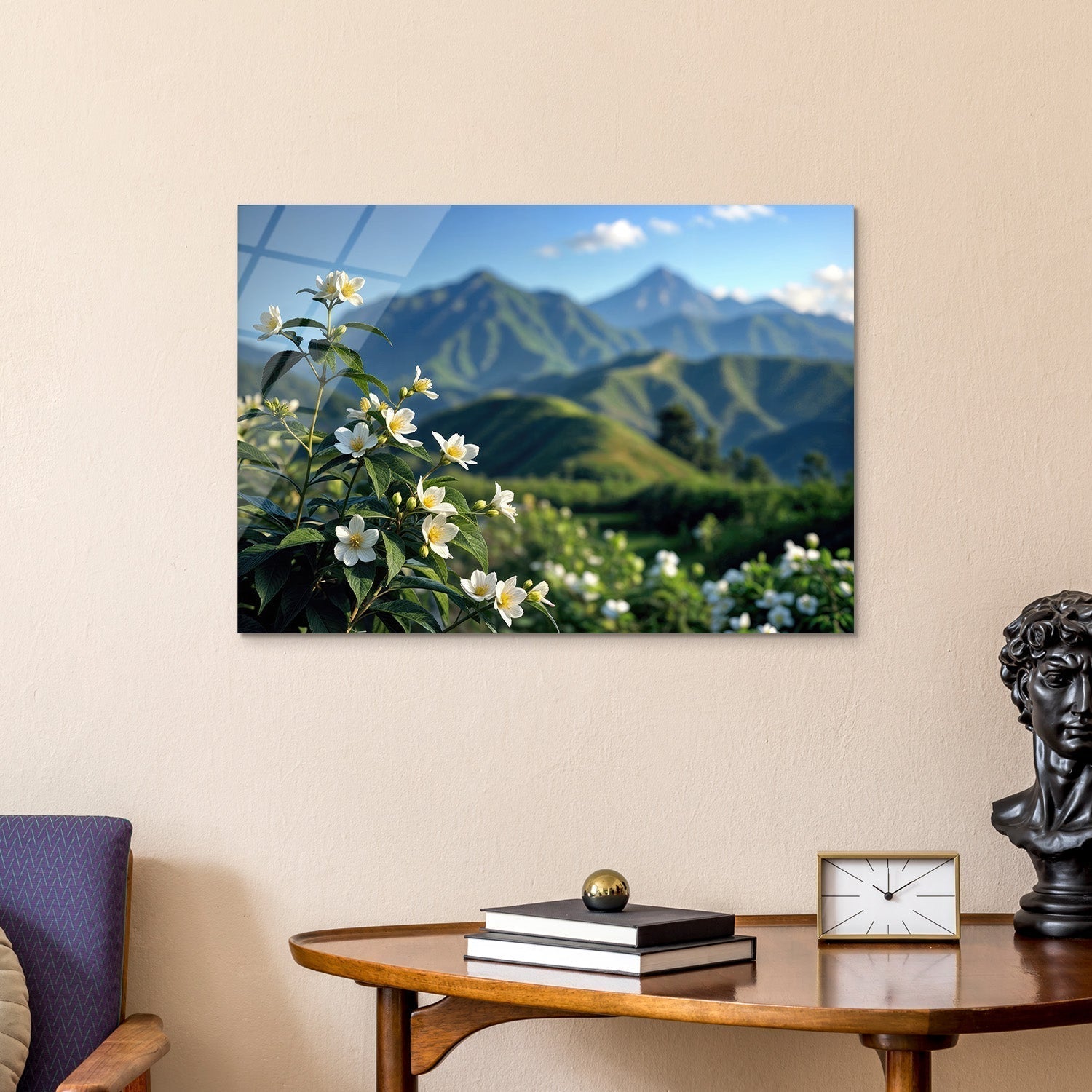 White flowers gently dance in the breeze against a backdrop of green slopes; the majestic mountains in the background create a stunning scenery, This breathtaking natural landscape will add a sense of peace and tranquility to your home, bringing serenity to your everyday life,