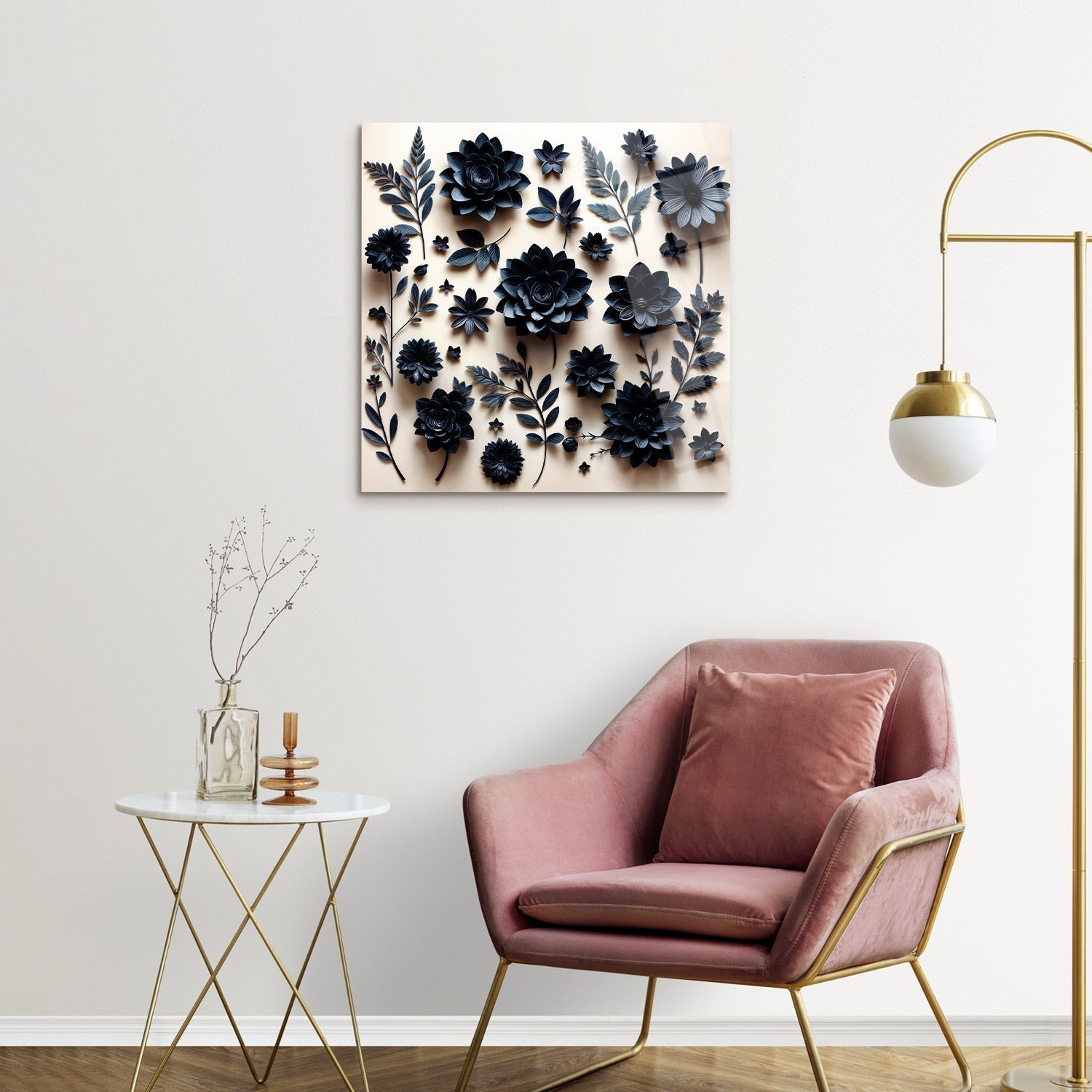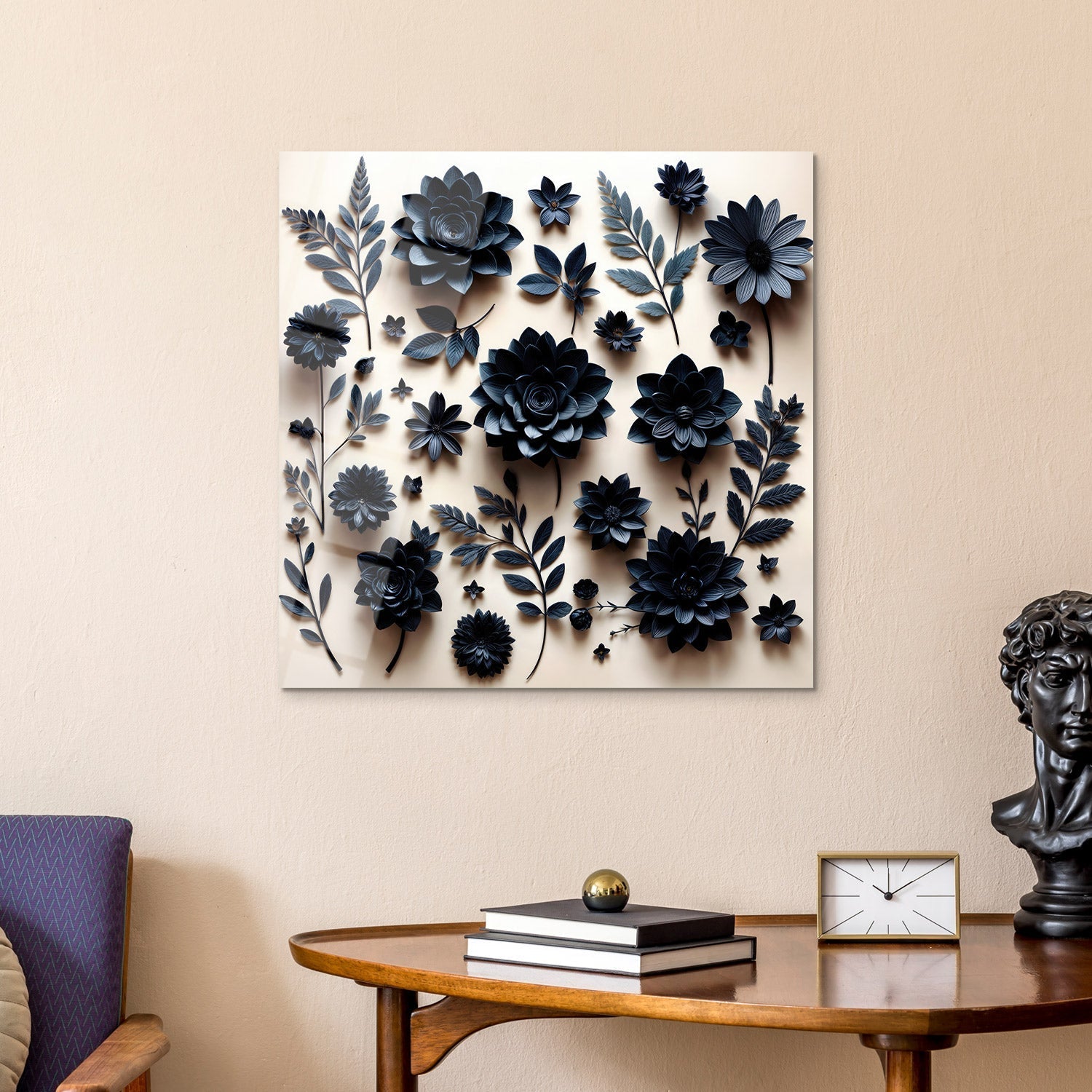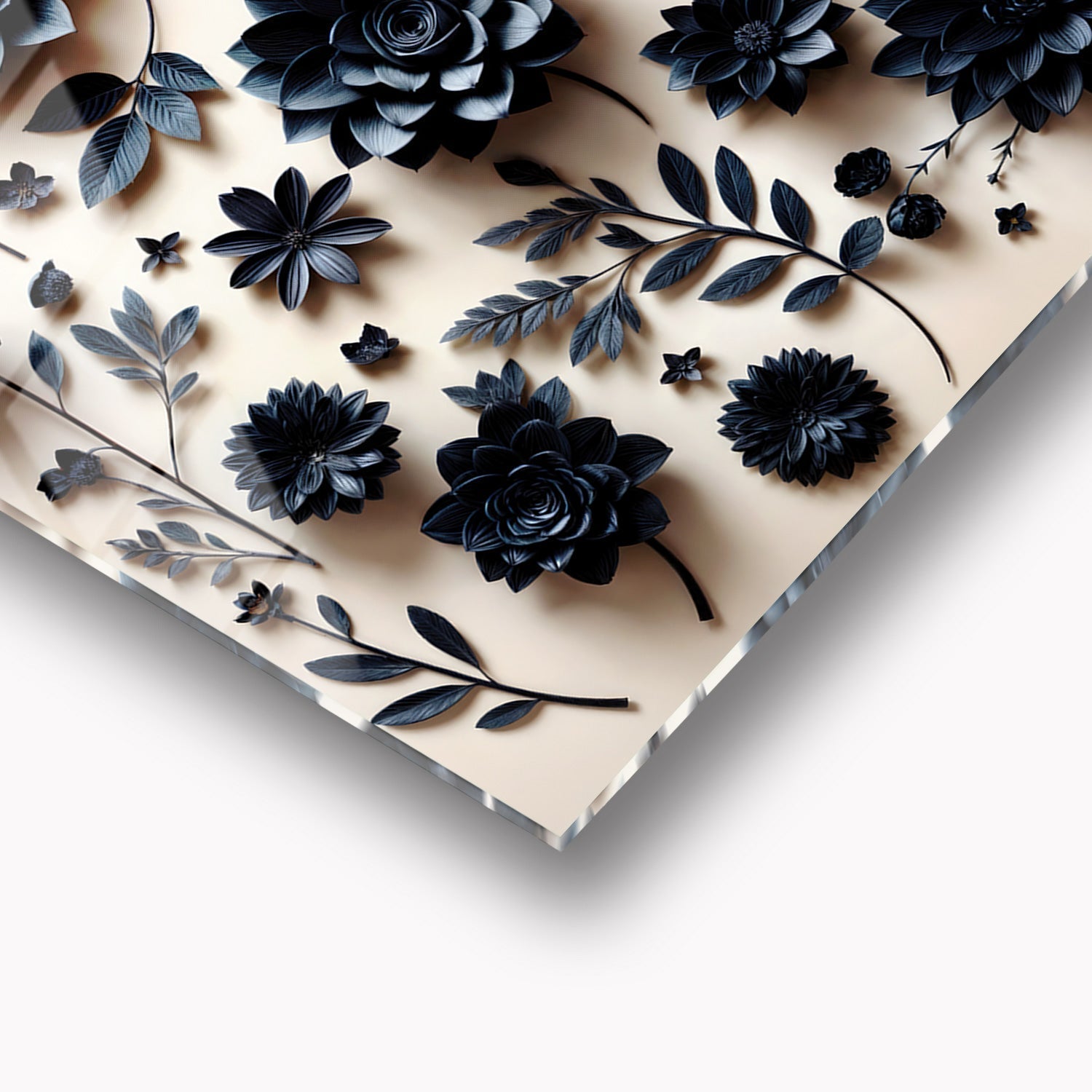 Dark-colored paper flowers and leaves arranged on a light-colored background create a striking contrast, reviving the simple beauty of aesthetics in the eyes of the beholders,