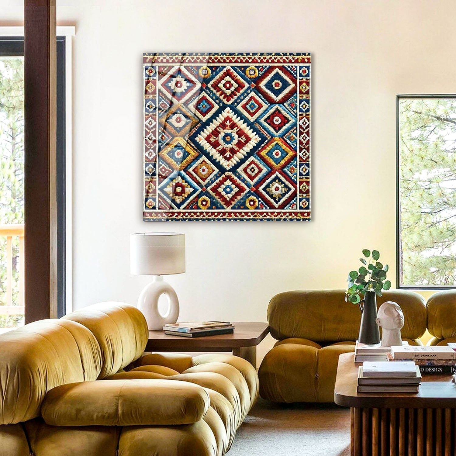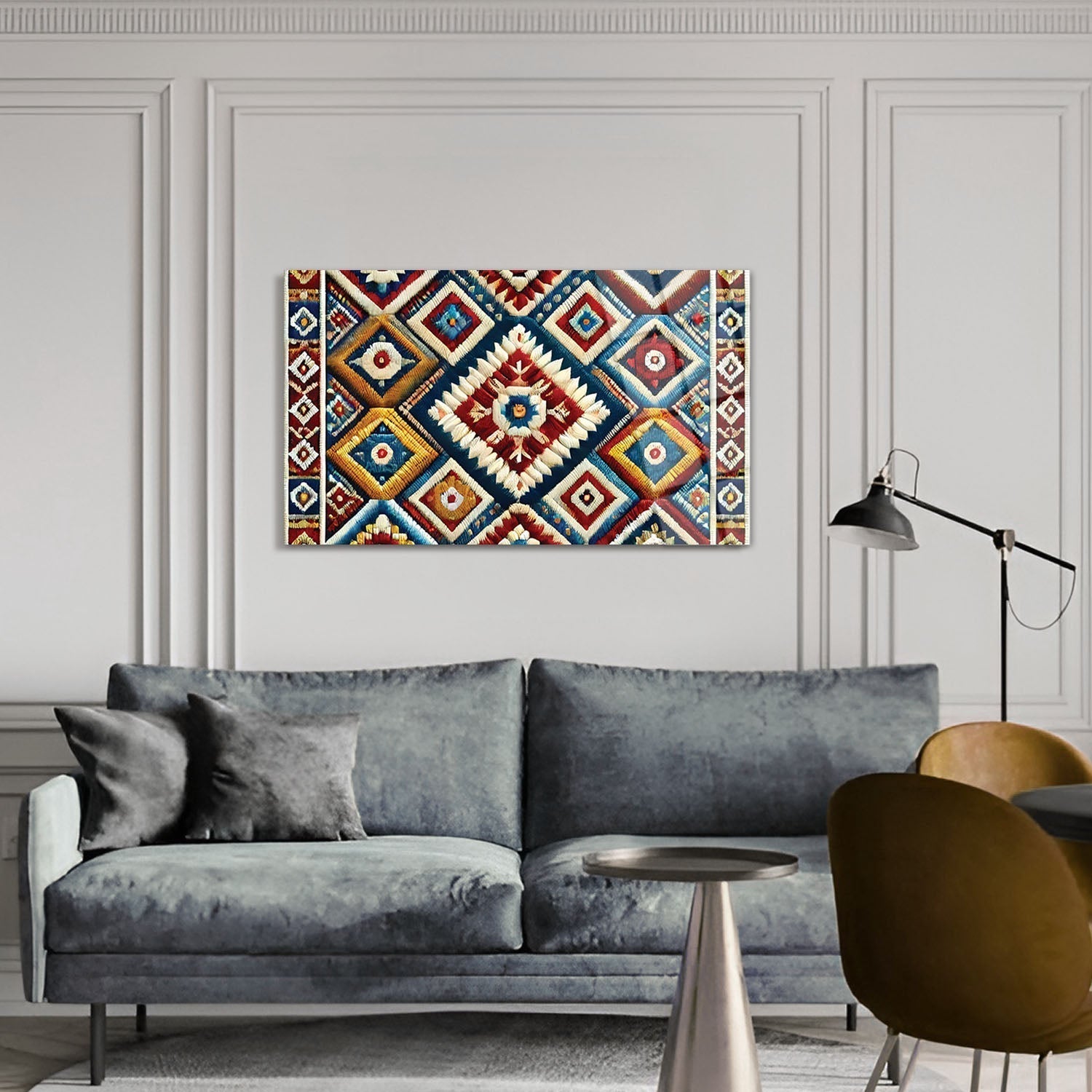 Traditional motifs meet rich colors to create a captivating composition, Each detail stands out as an elegant reflection of cultural heritage, The vibrancy of the woven patterns adds warmth and an authentic atmosphere to any space, Incorporate this cultural touch into your home, adding meaning and depth to every moment,
