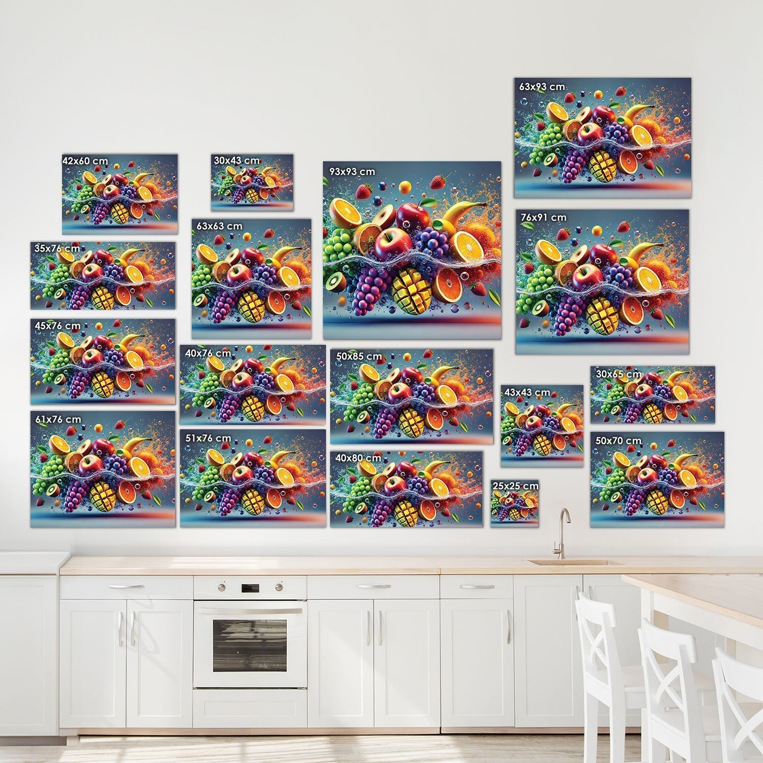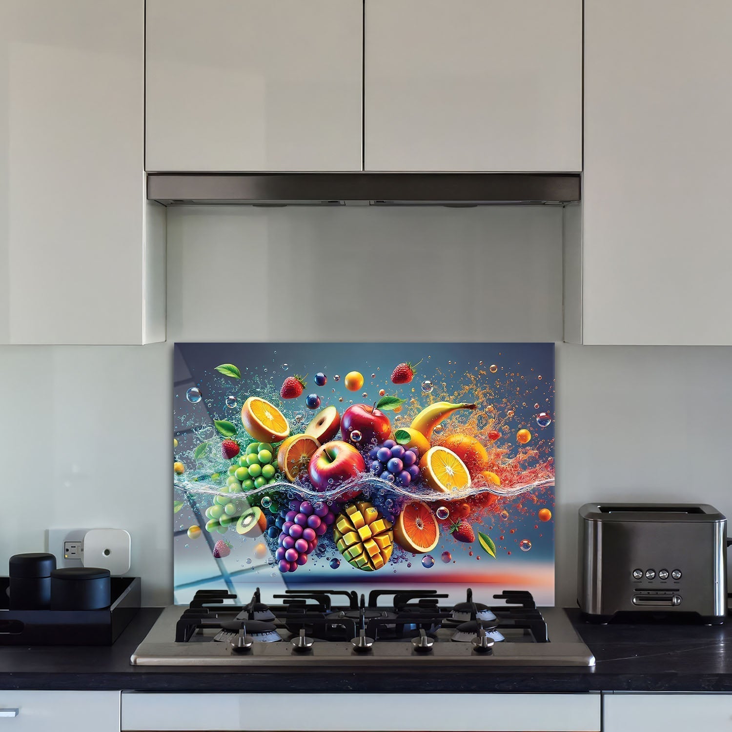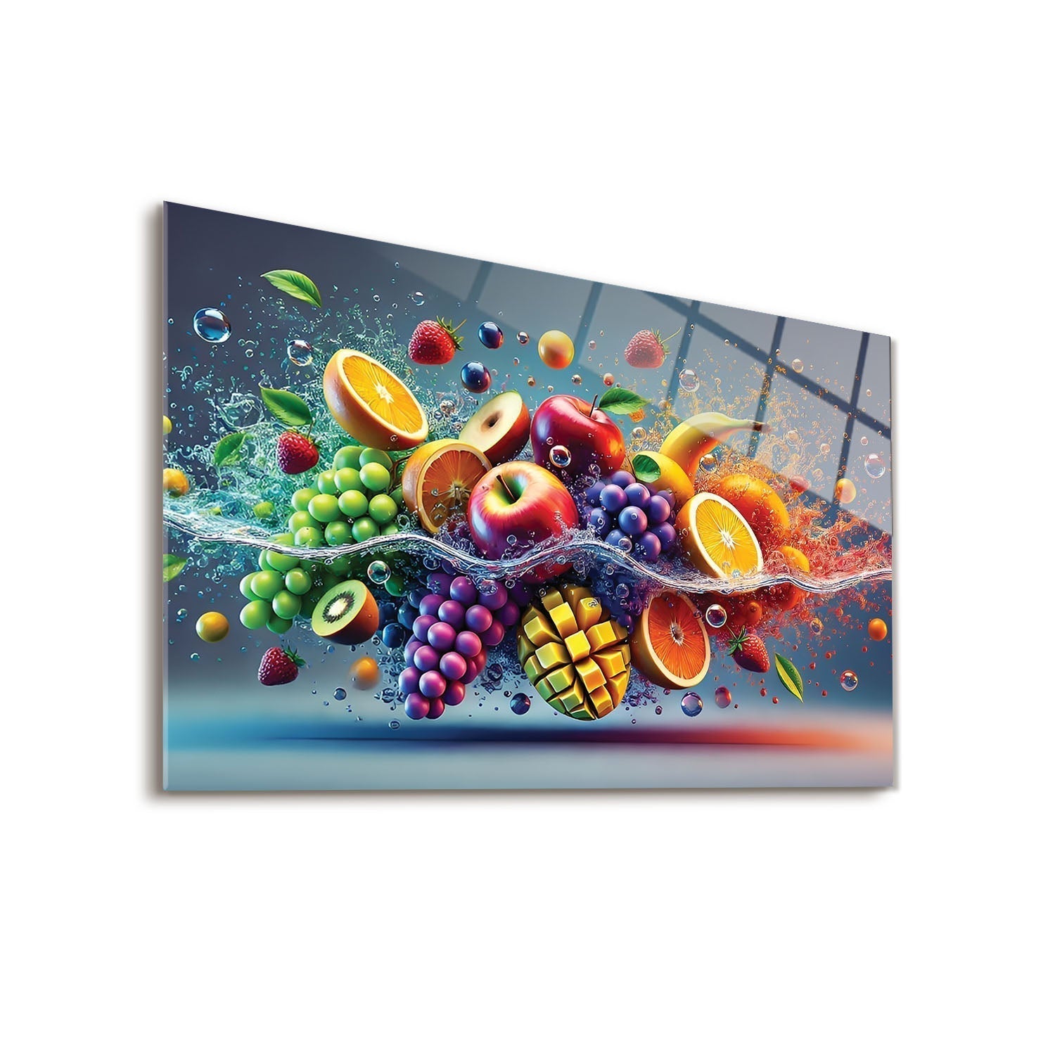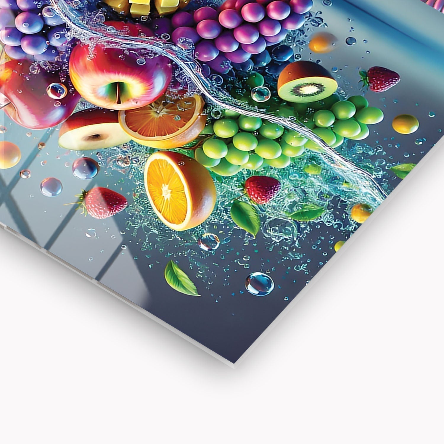 Colorful fruits are performing a dance in the water, Each fruit reflects the energy and freshness of nature, The vibrant colors and movement of the water reveal the dynamism and beauty of life,