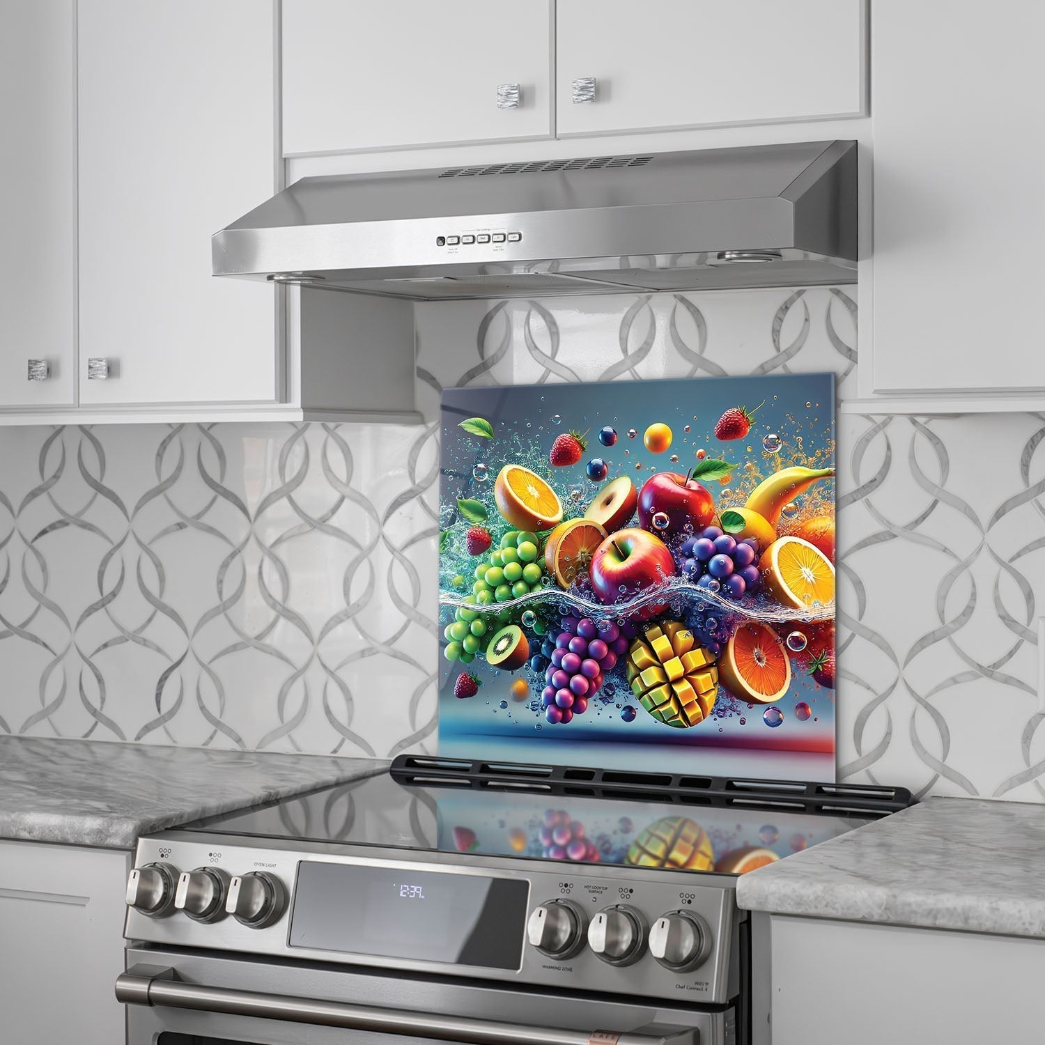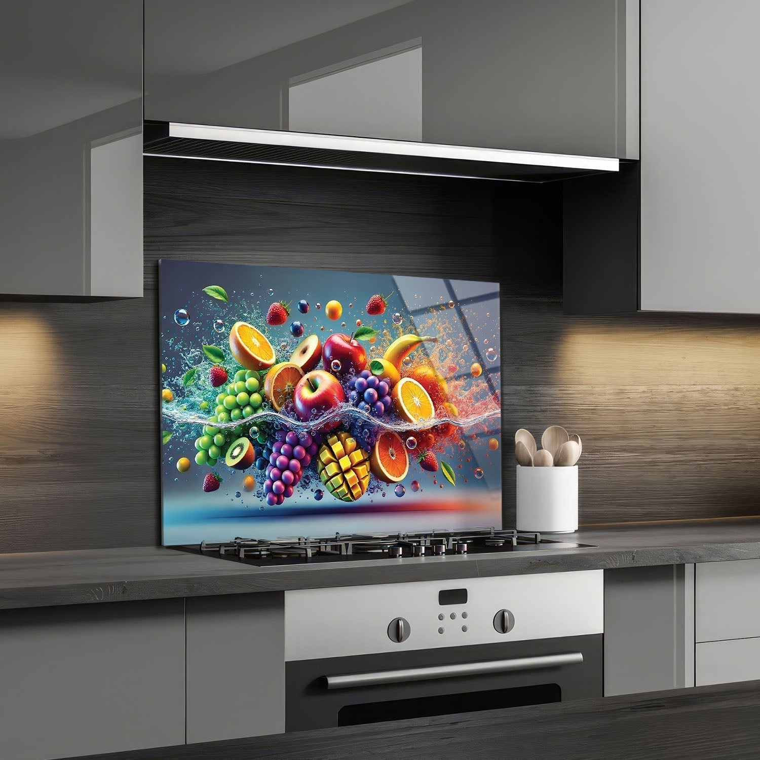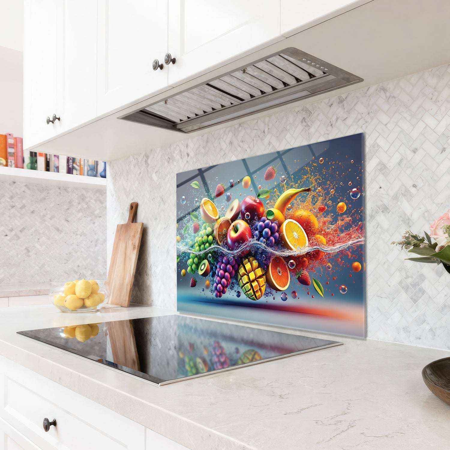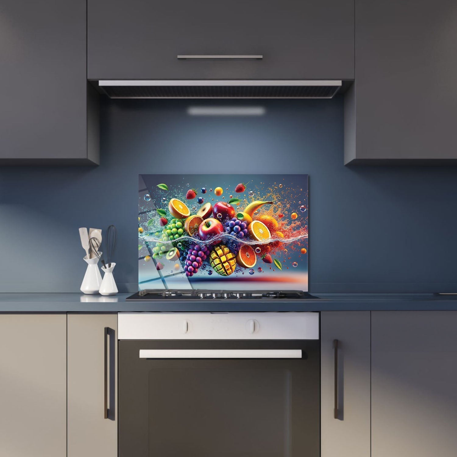 Colorful fruits are performing a dance in the water, Each fruit reflects the energy and freshness of nature, The vibrant colors and movement of the water reveal the dynamism and beauty of life,