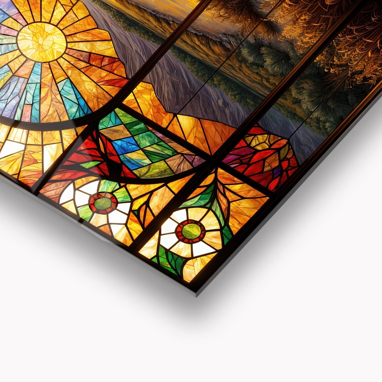 The warm tones of the setting sun rise behind the mountains, illuminating a radiant river, and casting a peaceful light through the stained glass windows, The mesmerizing details of the piece invite the viewer to embrace the serenity of nature,