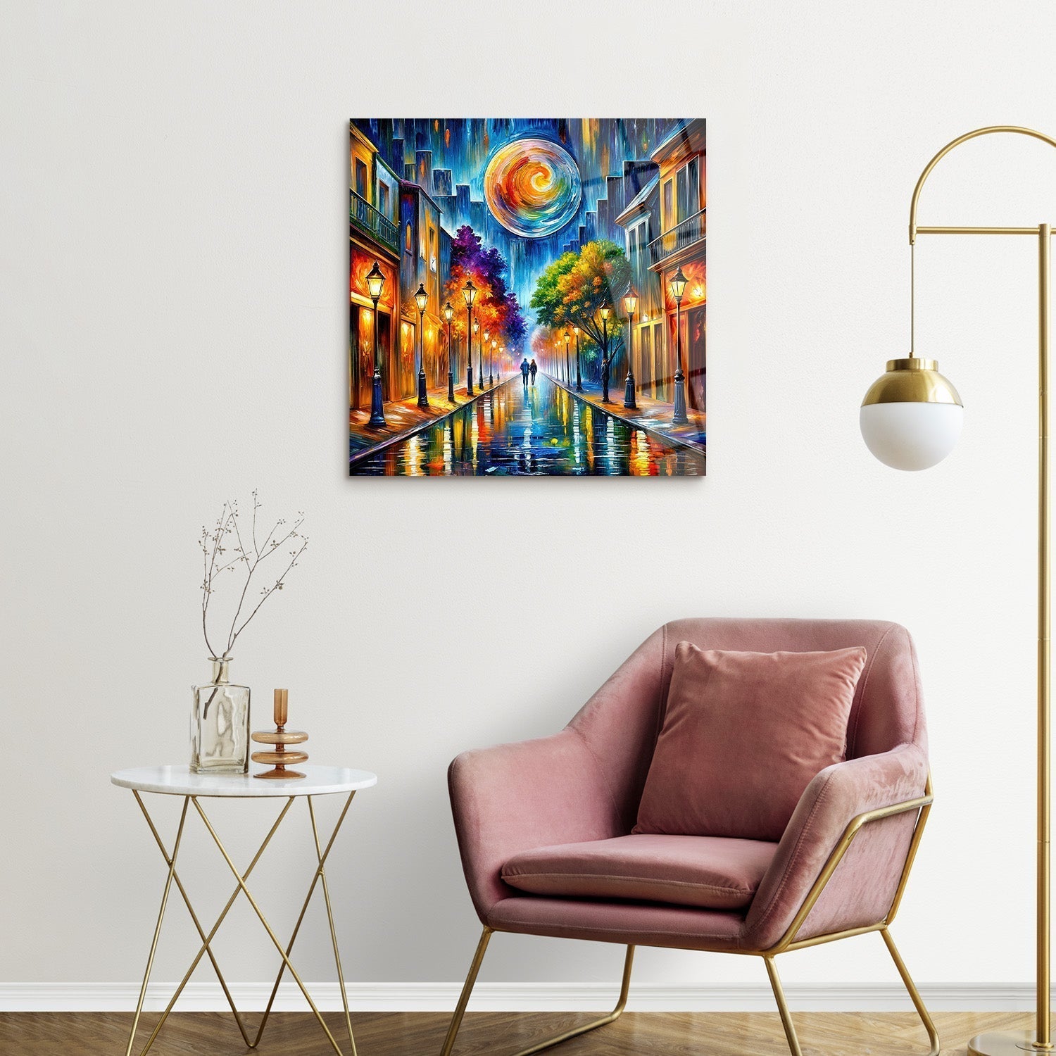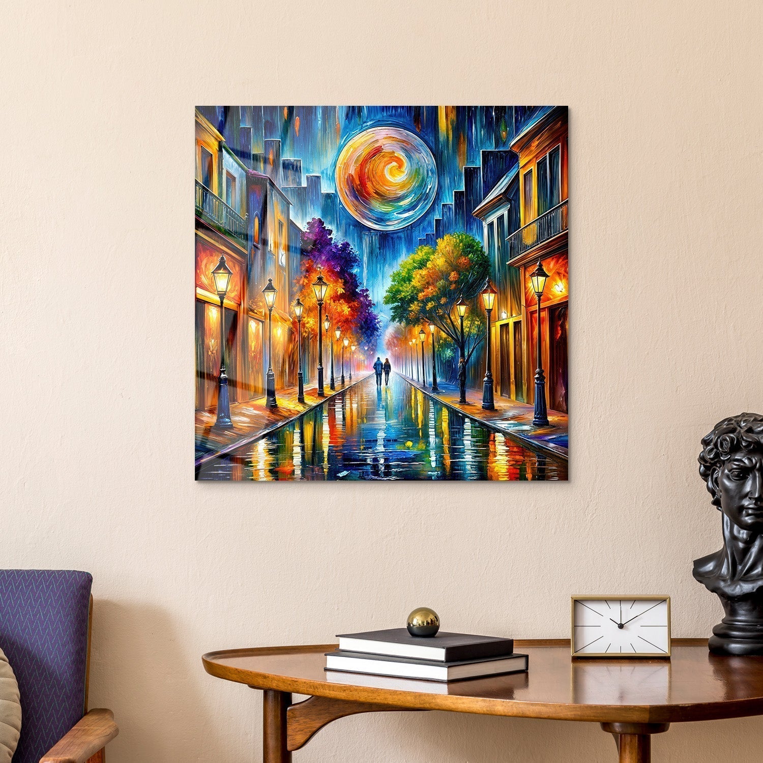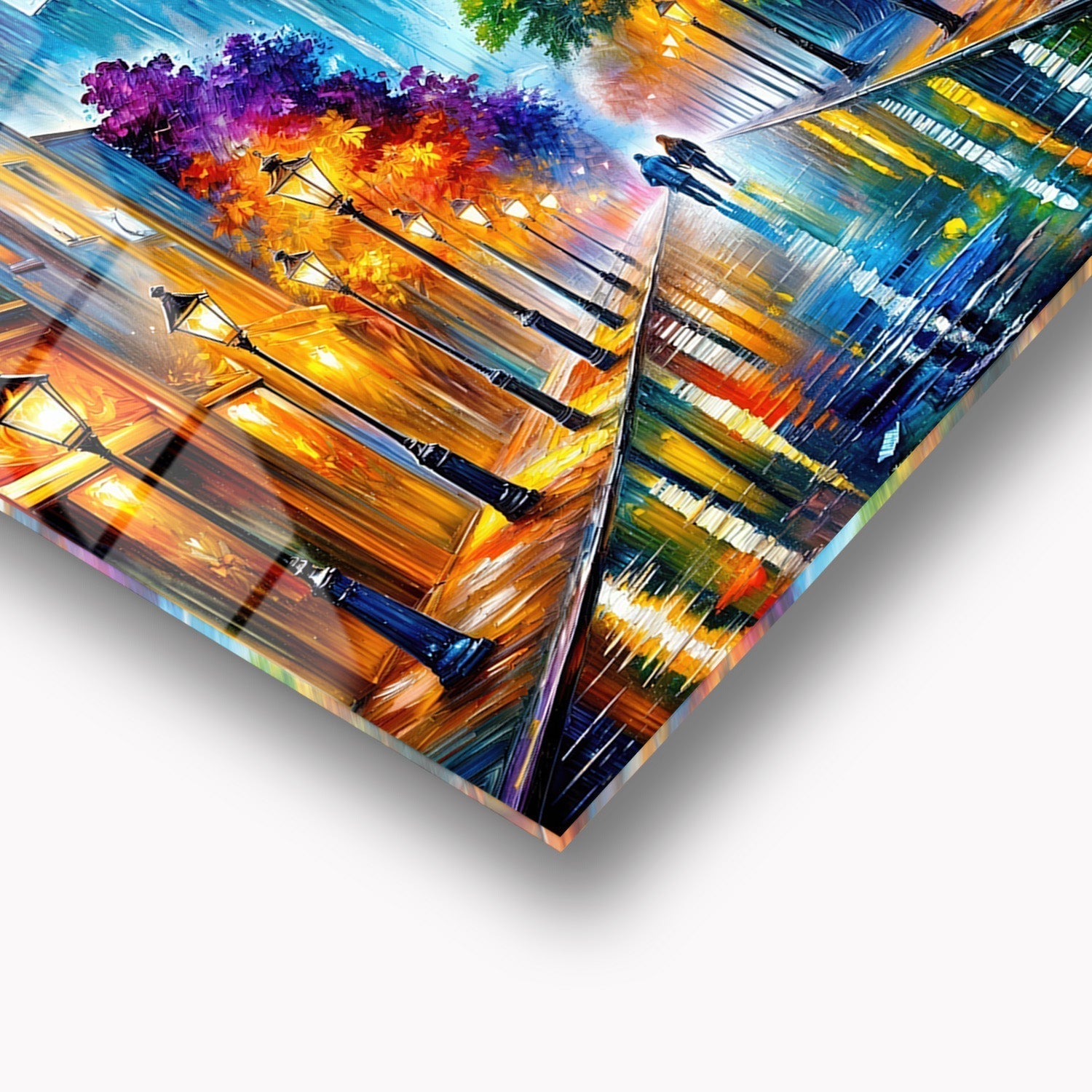The vibrant dance of colors comes to life in an oil painting of a cityscape, reflecting the magic and romance of the night, We bring you this artwork that captures the enchantment of the night,