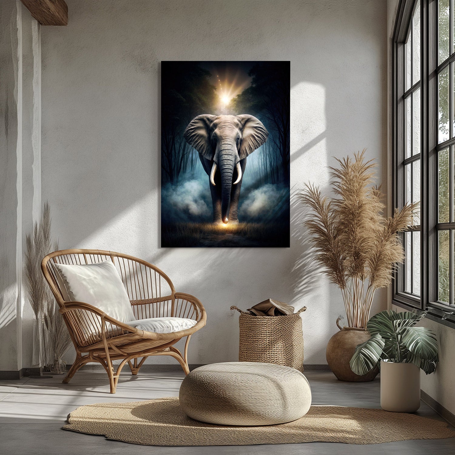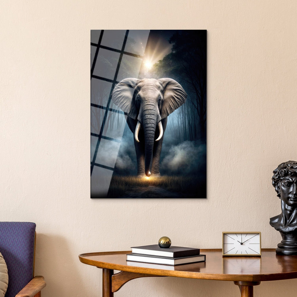 In the misty morning of the forest, an elephant walks calmly towards the light, creating a captivating silhouette illuminated by the rays of the sun, This impressive creature brings together its noble stance and the peaceful nature surrounding it, offering you a glimpse into its majestic presence and the tranquility of its surroundings.