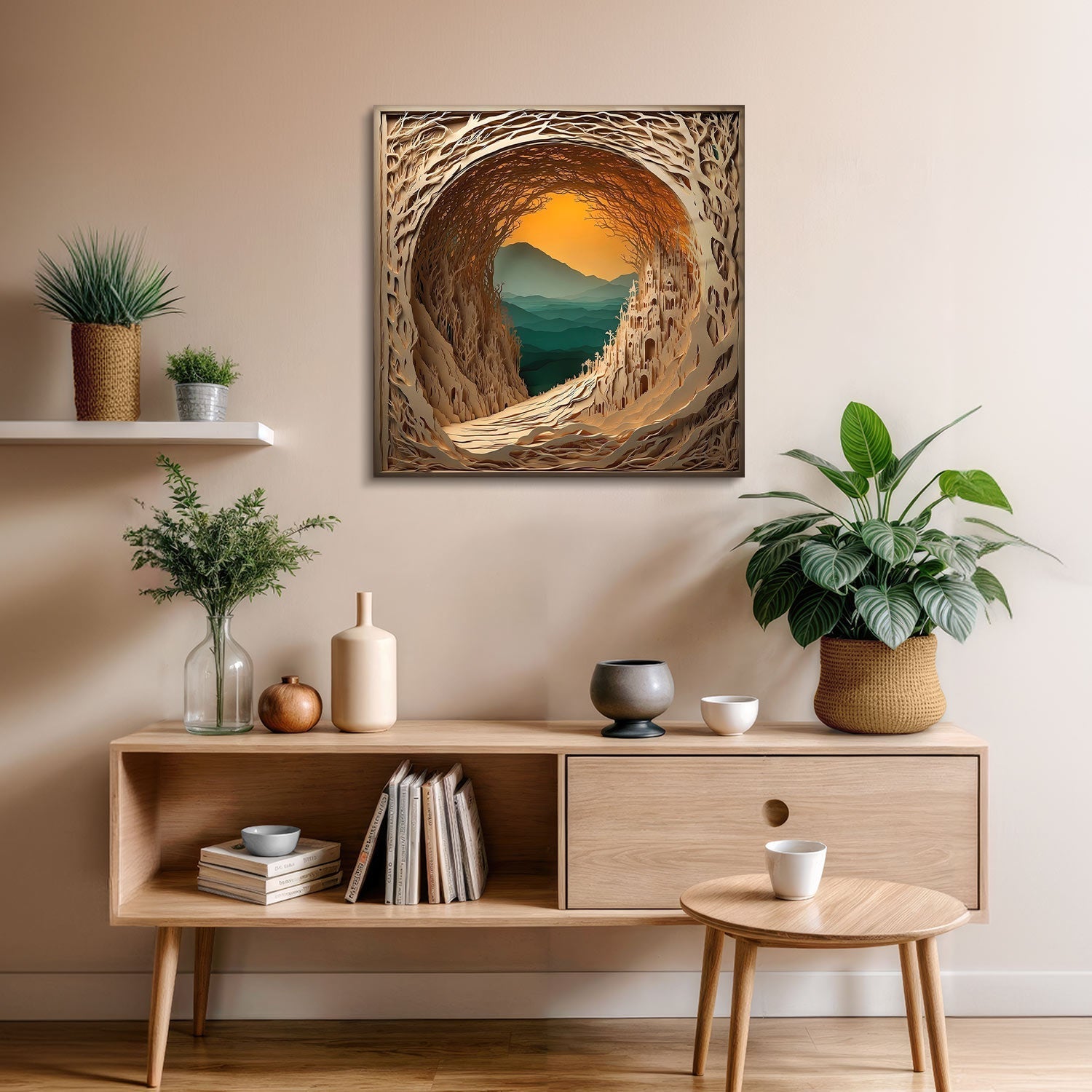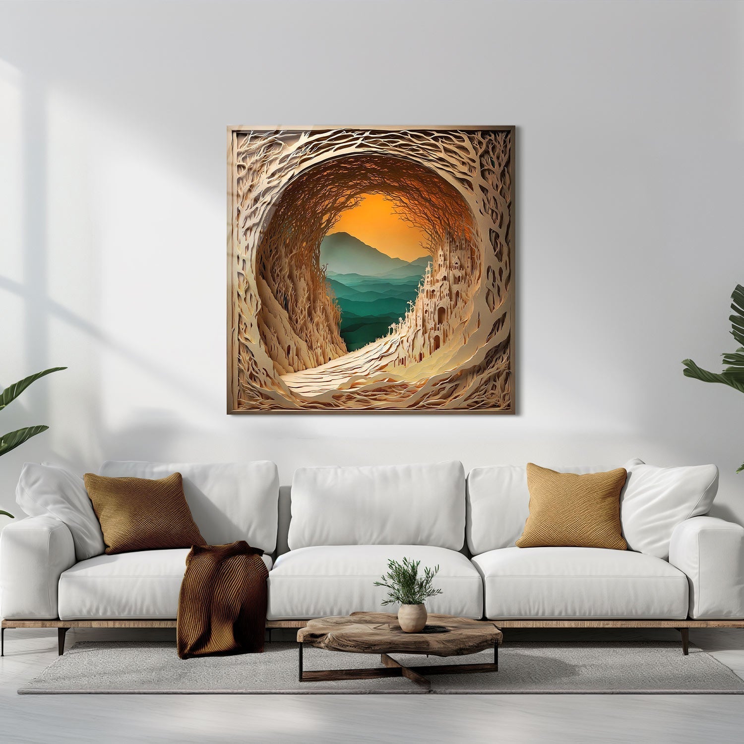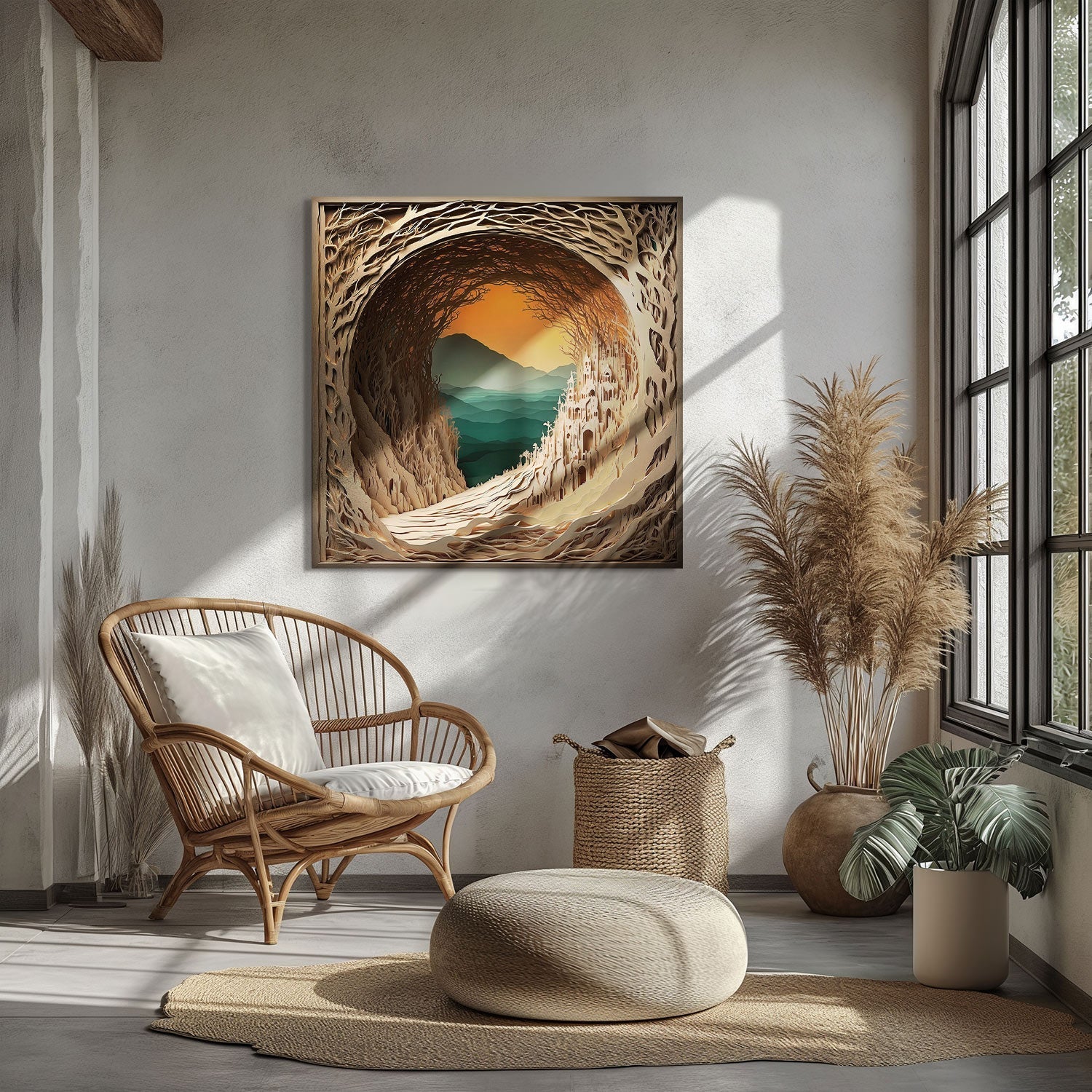 The captivating tunnel shaped by the carved details of tree branches offers a passage through the layers of time, inviting you beyond the endless green valleys, This artwork, whispering stories of the past with each layer, adds a timeless landscape and a peaceful escape to your room,