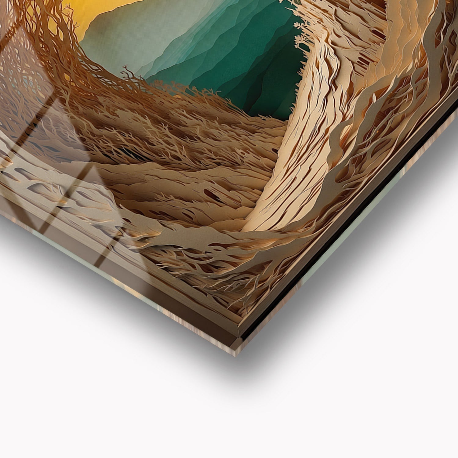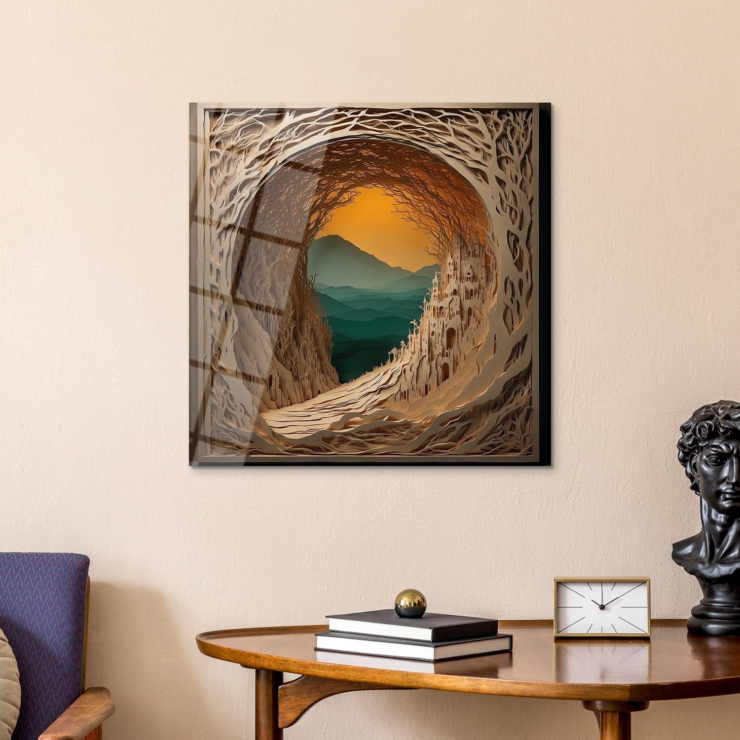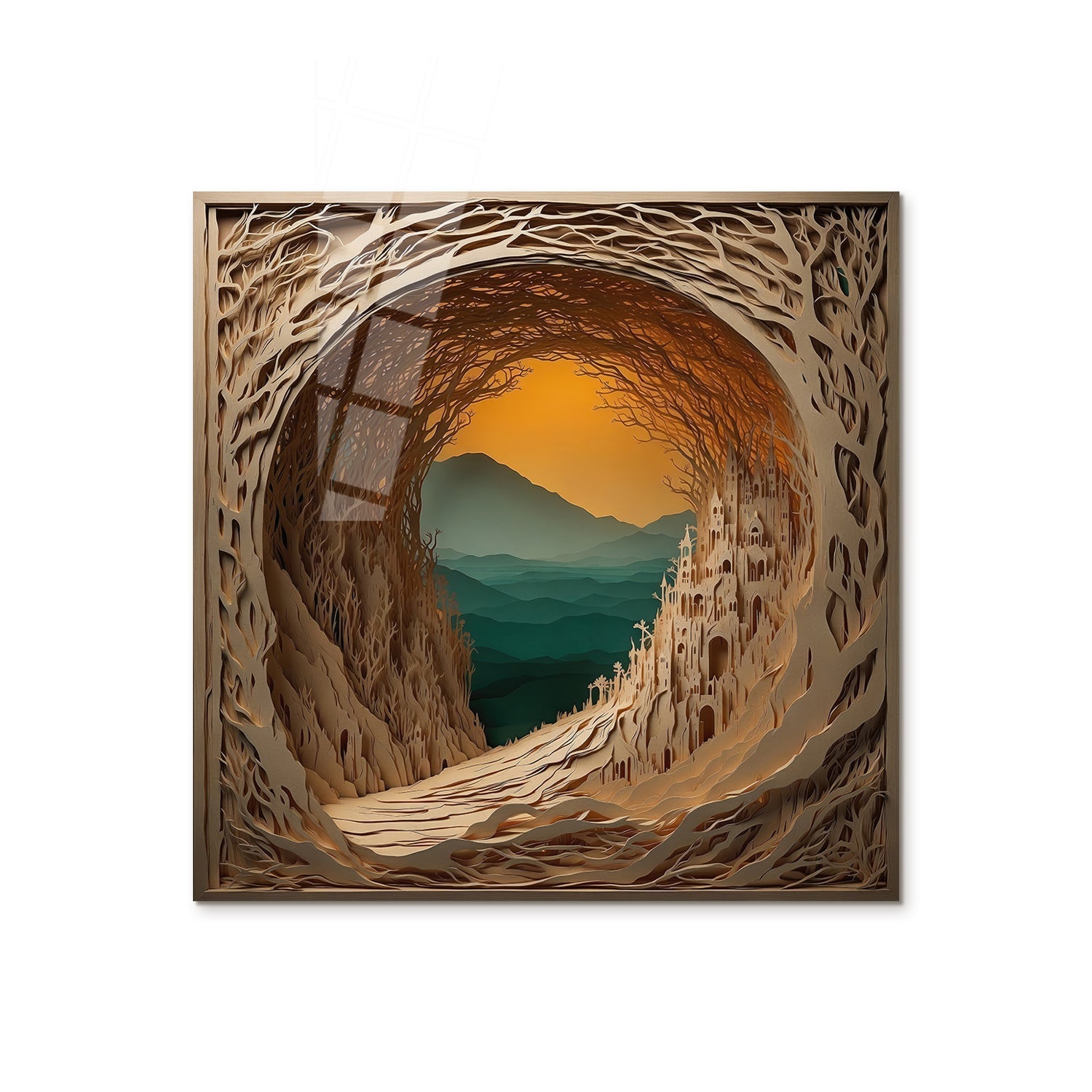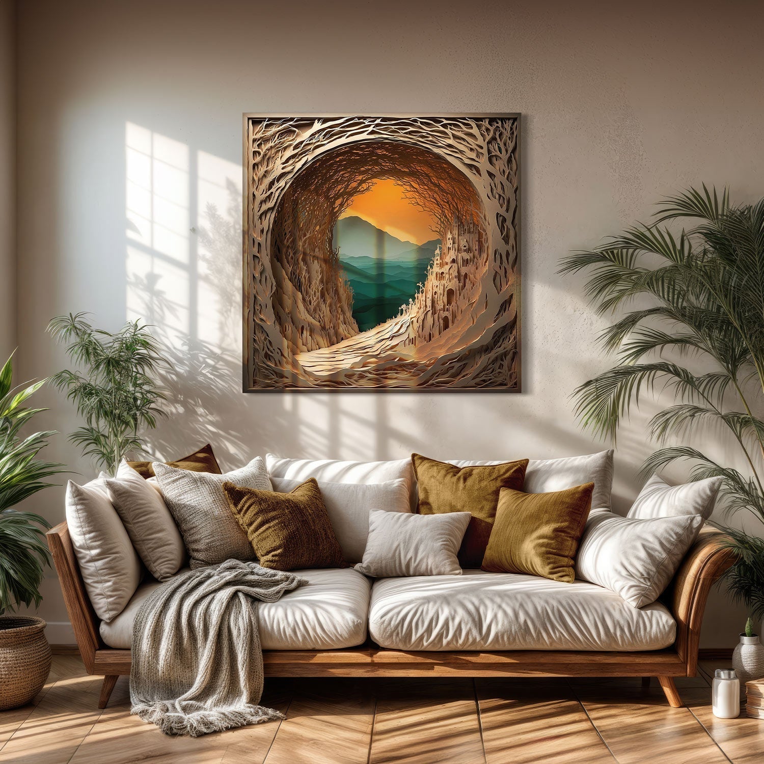 The captivating tunnel shaped by the carved details of tree branches offers a passage through the layers of time, inviting you beyond the endless green valleys, This artwork, whispering stories of the past with each layer, adds a timeless landscape and a peaceful escape to your room,
