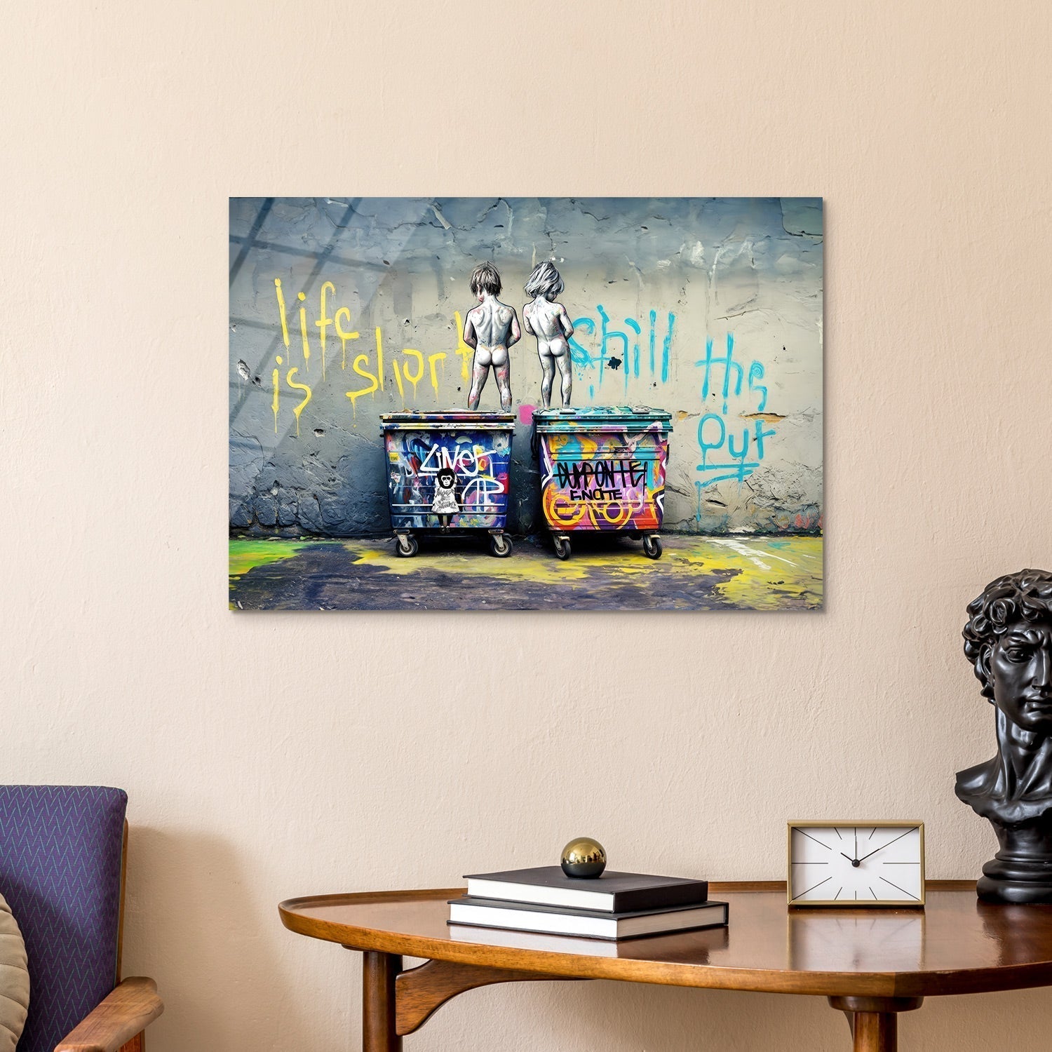 The two children figures atop the garbage containers reflect the fragile moments of life drawn on the city walls, This scene is like an invitation to pause amidst the flow of life and appreciate the value of that moment,