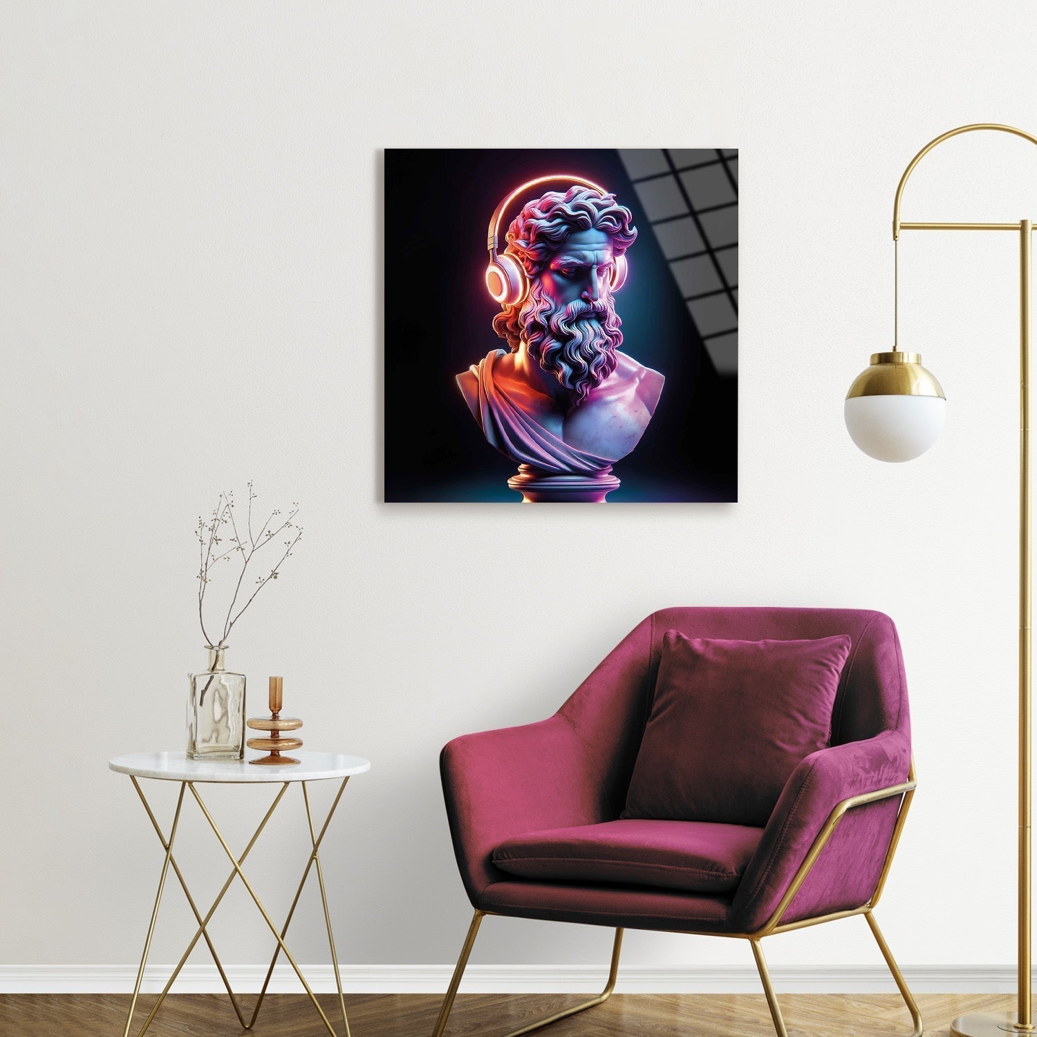 Neon Zeus is a striking blend of ancient mythology and modern aesthetics, where the powerful image of Zeus is reimagined with a contemporary twist, The vibrant neon colors contrast beautifully with the classical sculpture, creating a unique fusion of past and present, This artwork invites you to explore the intersection of history and technology, bringing a bold statement piece to any space that resonates with both tradition and innovation,