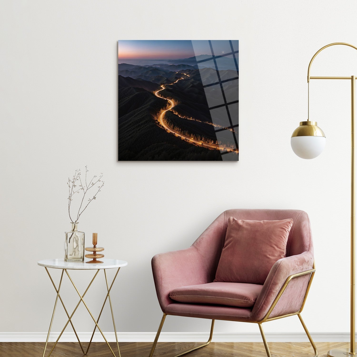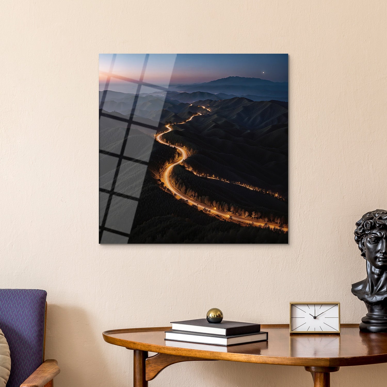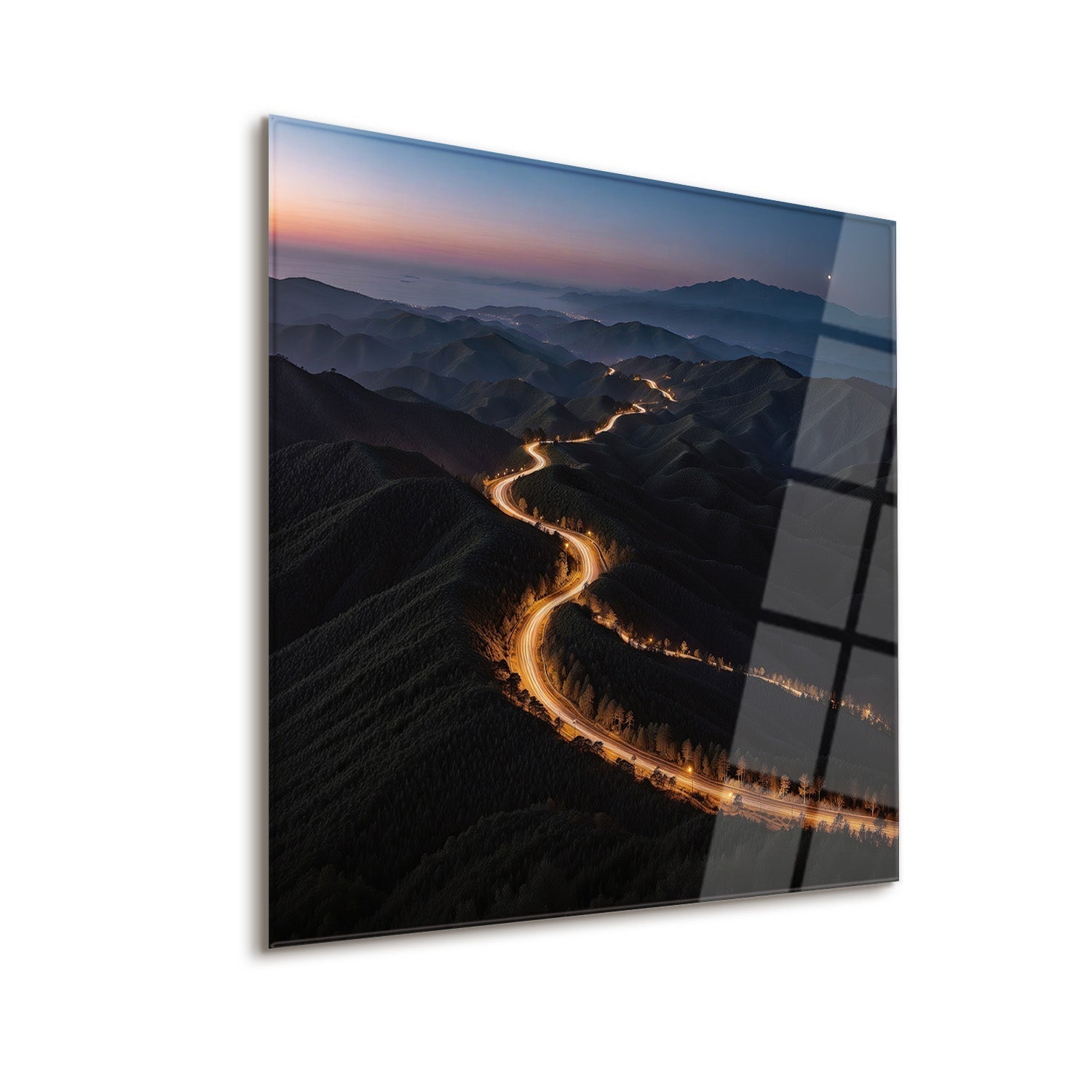 A winding road intricately weaves through the mountain ridges like a string of pearls in the evening's fading light, while the distant city lights delicately twinkle on the horizon, This magnificent natural scenery eagerly awaits to infuse your home's atmosphere with profound tranquility,