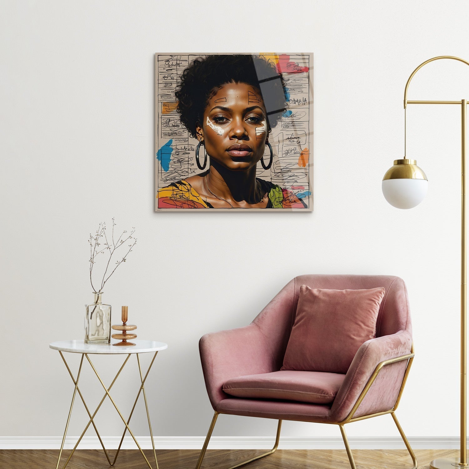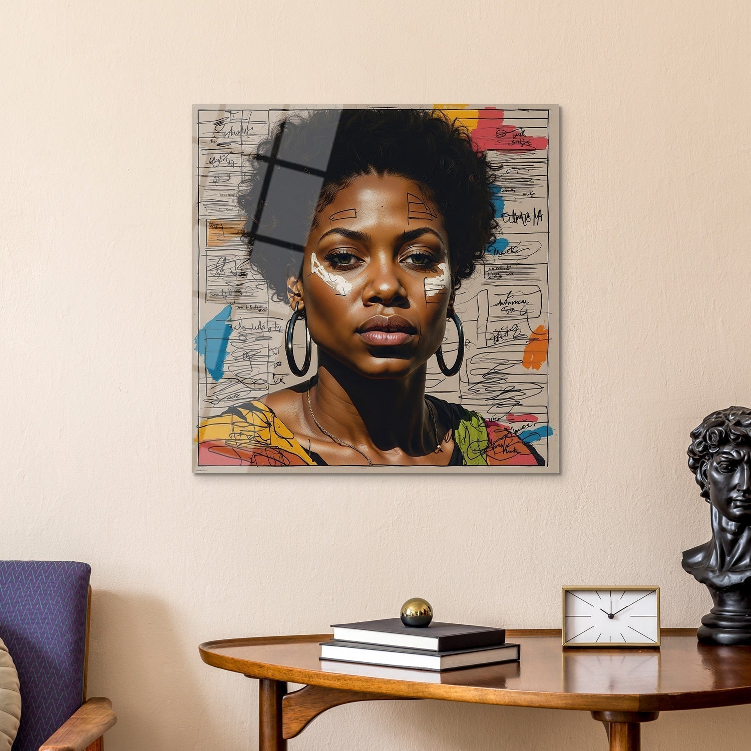 The portrait of the woman in the foreground creates a contrast with the energetic writing and bursts of color in the background, The powerful expression and story offered by this visual artwork will add a unique aesthetic to the walls of any home,