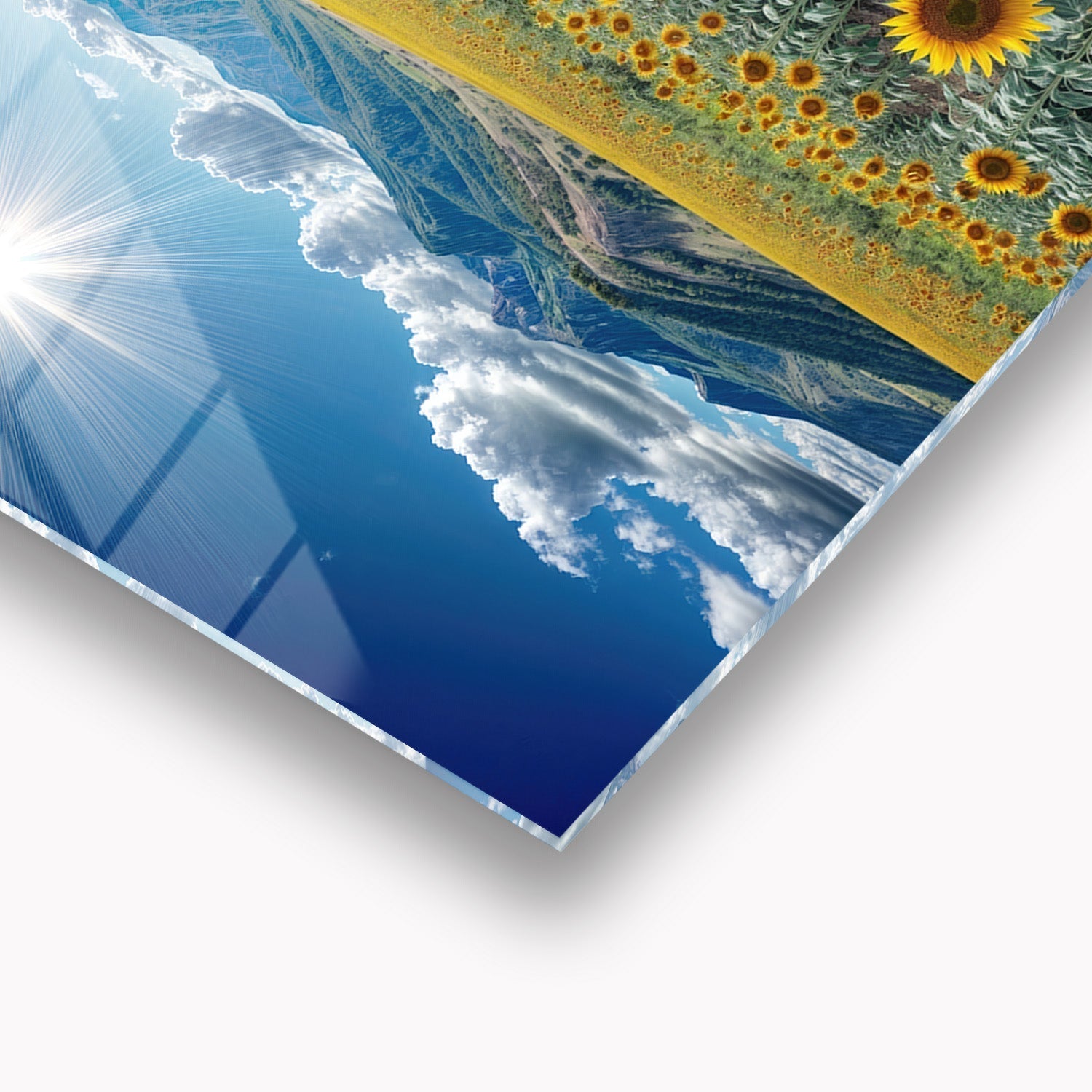 Under the golden rays of the sun, a sunflower field dances, breathing life into a lush valley under the shadow of mountains, This glittering scene will bring the touch of nature's heart to your home,