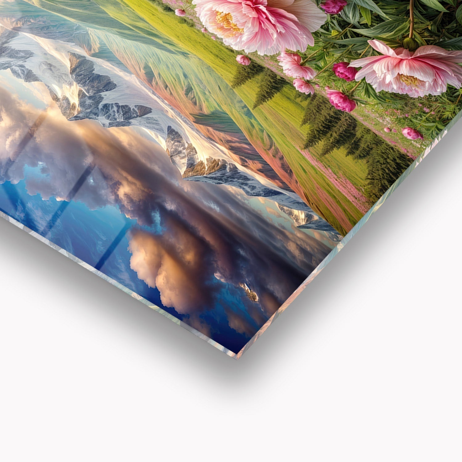 Valleys adorned with flowers reflecting the magic of twilight, weaving through snow-capped mountain ranges, This magnificent landscape offers a tranquility that will envelop your soul,