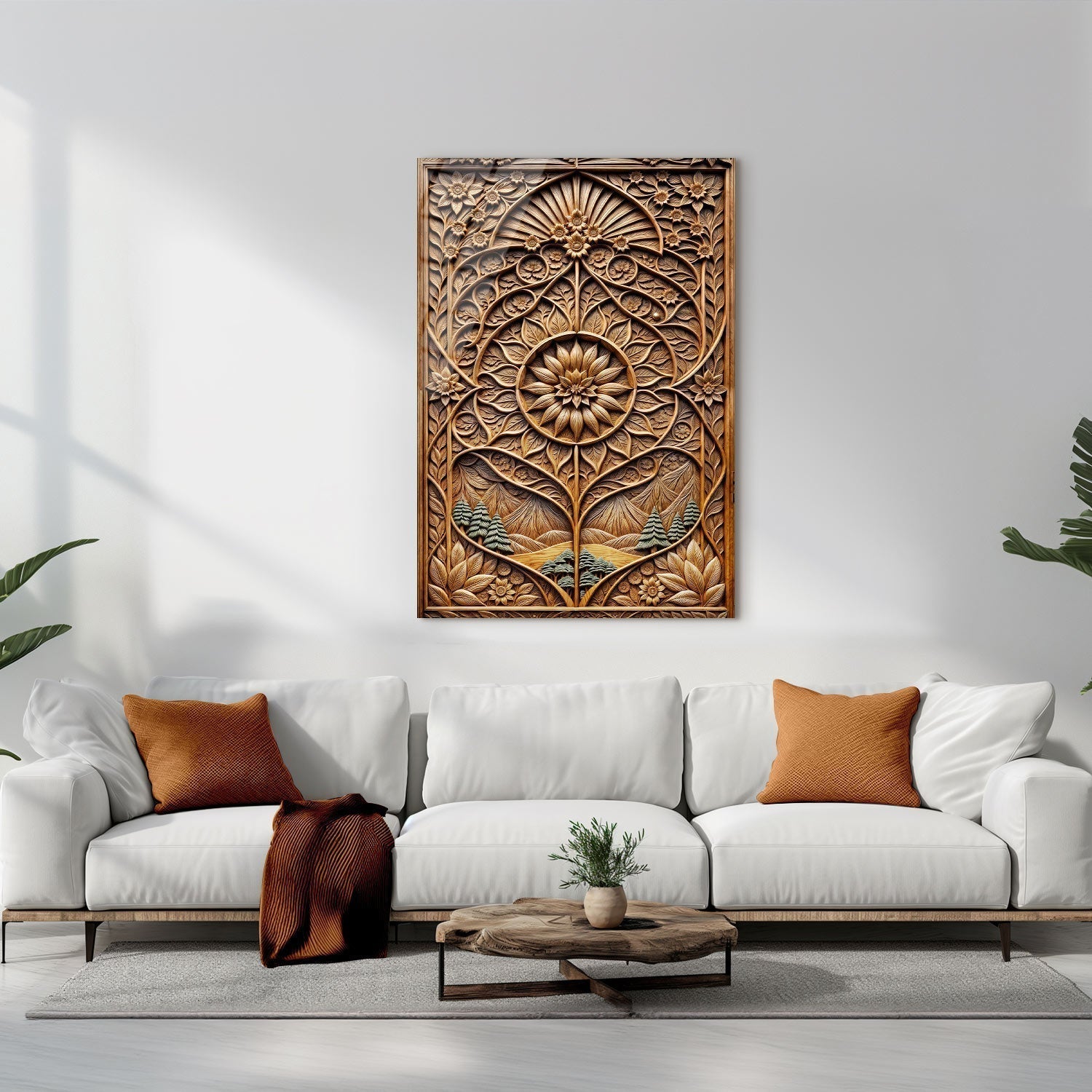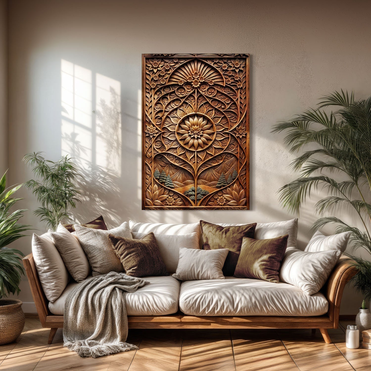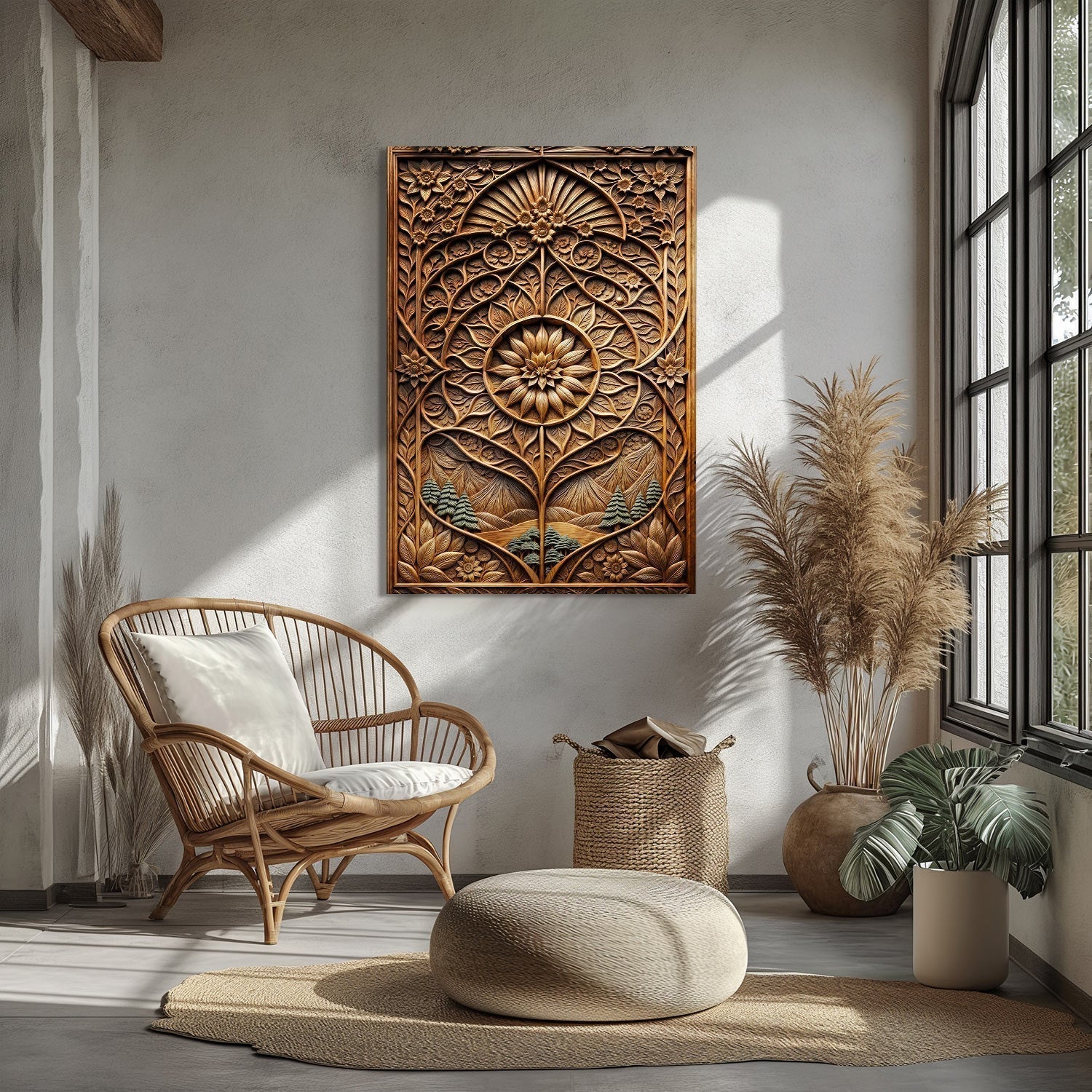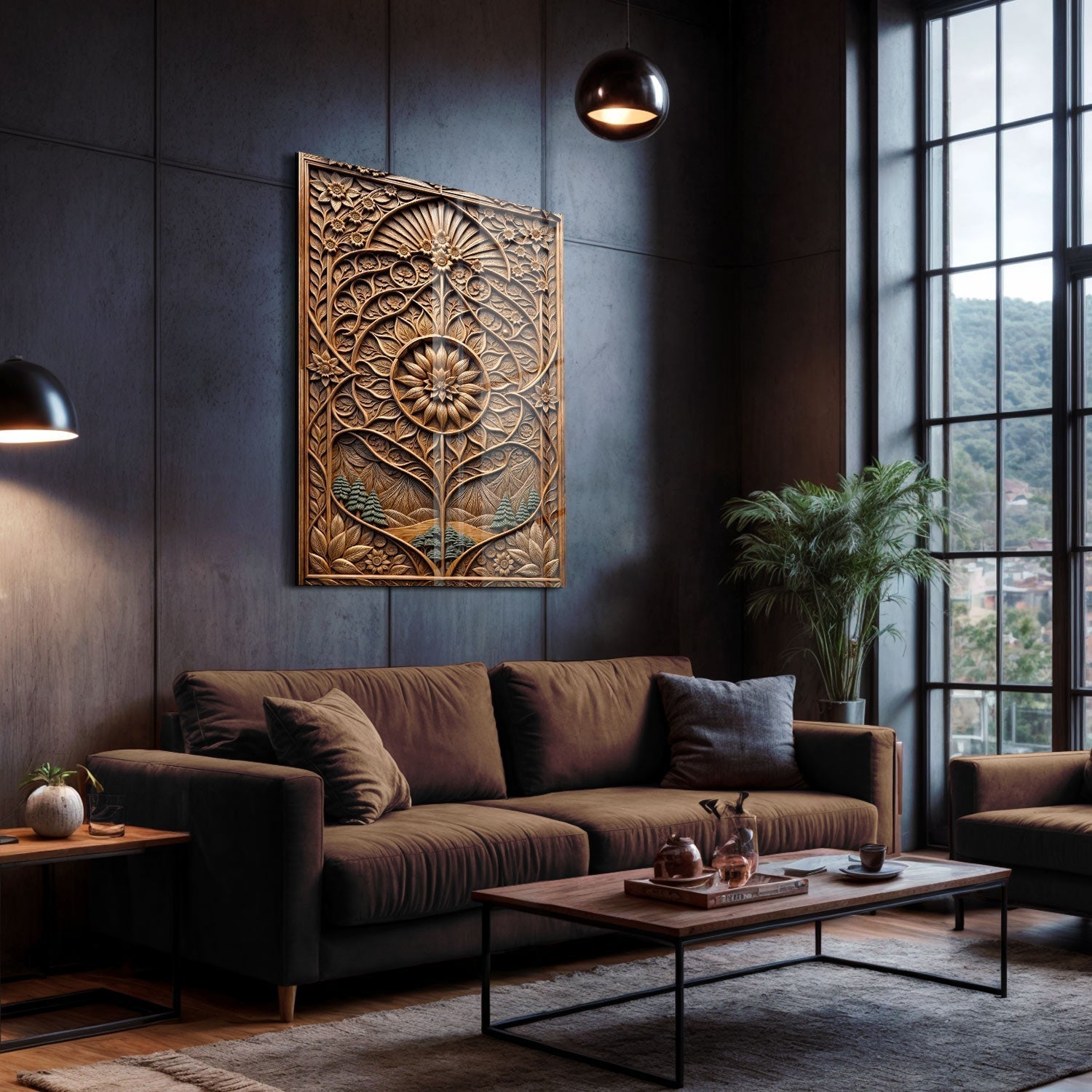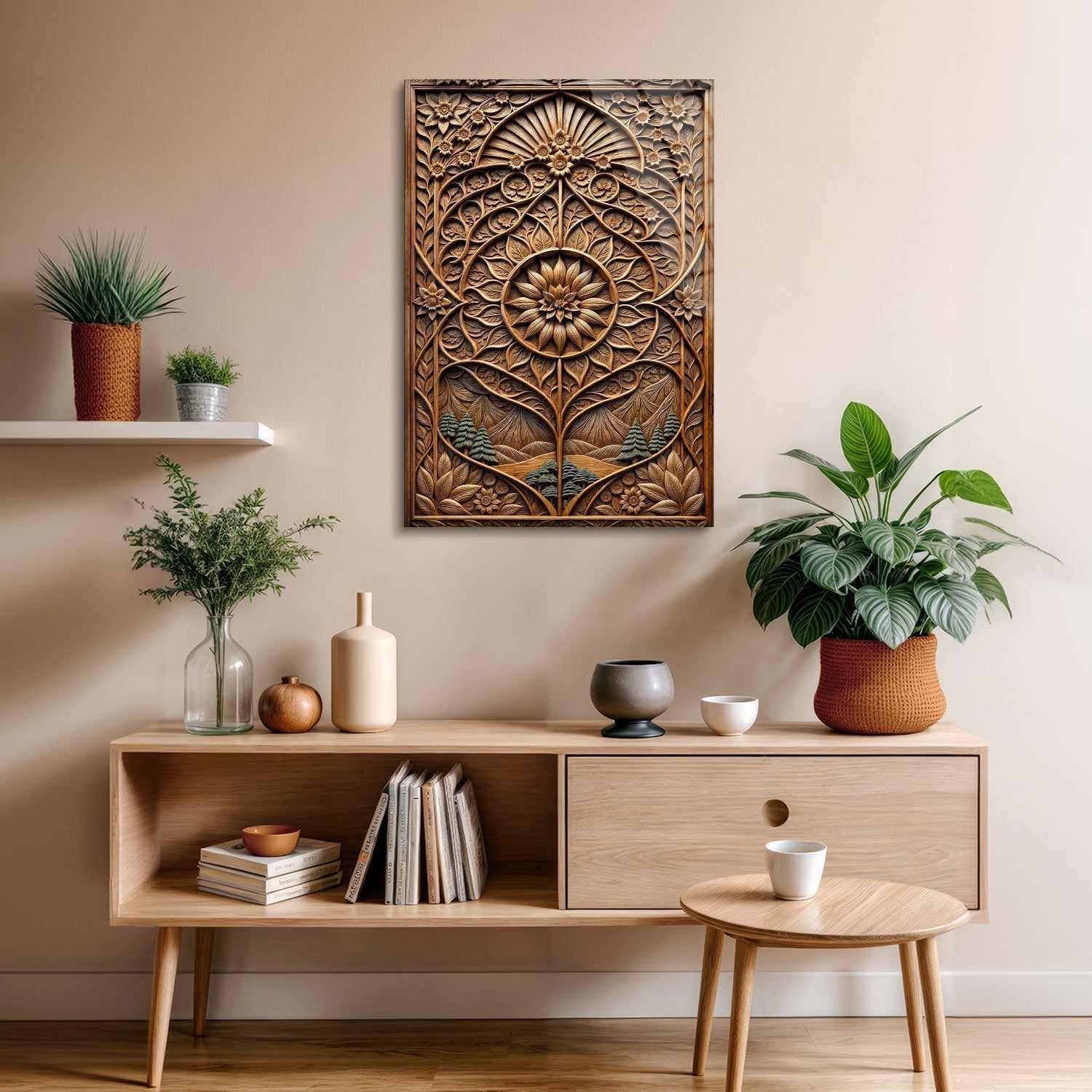 The intricate details of nature merge with the warm texture of wood, bringing serenity to your living space, Now is the perfect time to experience this unique piece in your home,